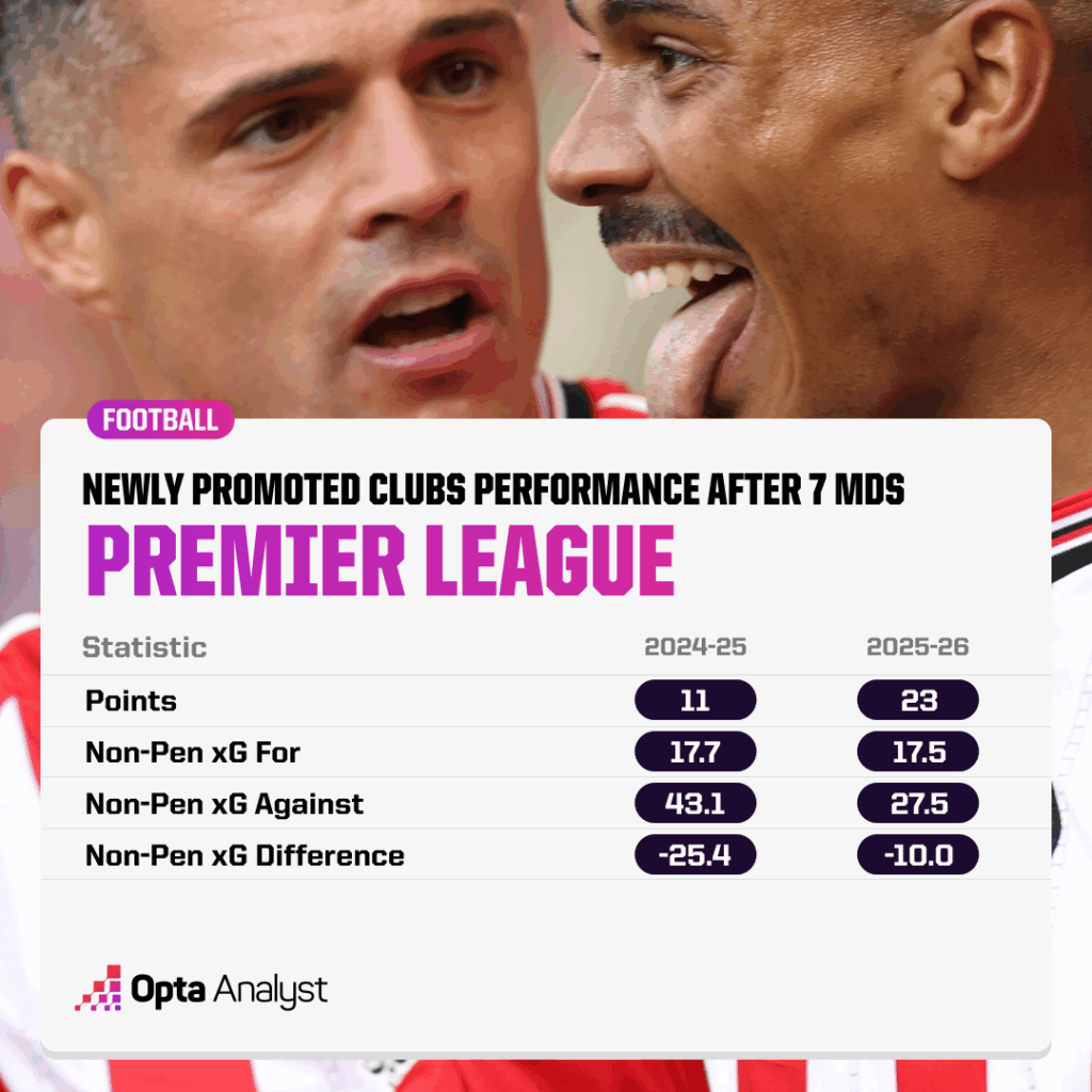 Среди этих трёх команд наибольшее впечатление производит «Сандерленд», который набрал 11 очков в семи матчах и занимает девятое место перед октябрьским перерывом на игры сборных. По очкам «чёрные коты» сравнялись с совокупным результатом всех трёх команд, вышедших в прошлом сезоне, после семи туров в сезоне 2024/25: и «Саутгемптон» (1), «Ипсвич Таун» (4) и «Лестер Сити» (6) тогда начинали с большими трудностями.