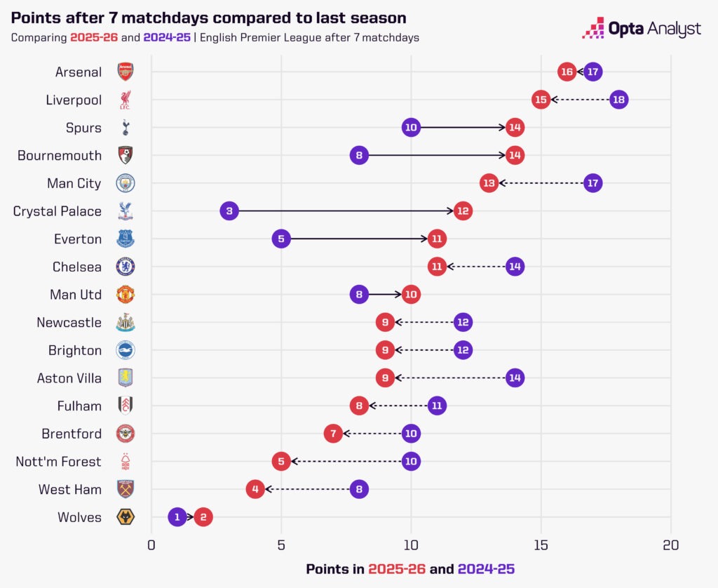 Если рассматривать 17 клубов, которые выступали в Премьер-лиге как в текущем, так и в прошлом сезоне, то лишь шести из них удалось улучшить свои показатели по очкам после первых семи туров по сравнению с сезоном 2024/25.