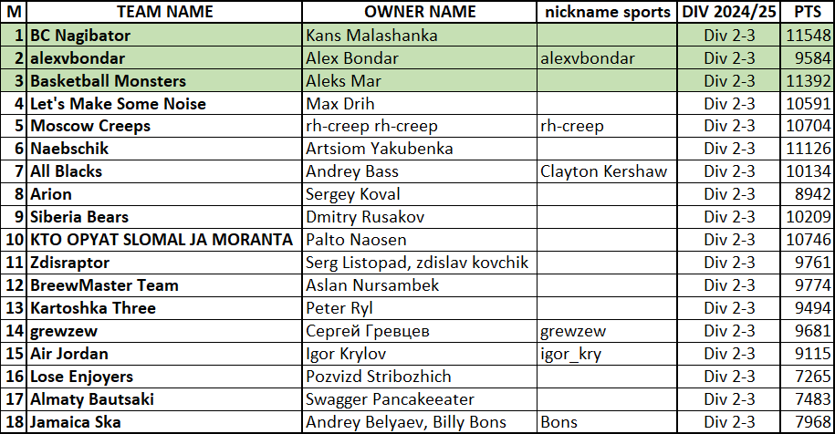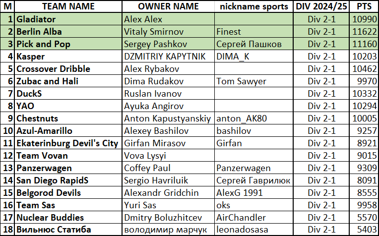 - Из лиг Дивизионов 2-1, 2-2, 2-3, 2-4 в Дивизион 1 поднимаются по 3 лучших команды