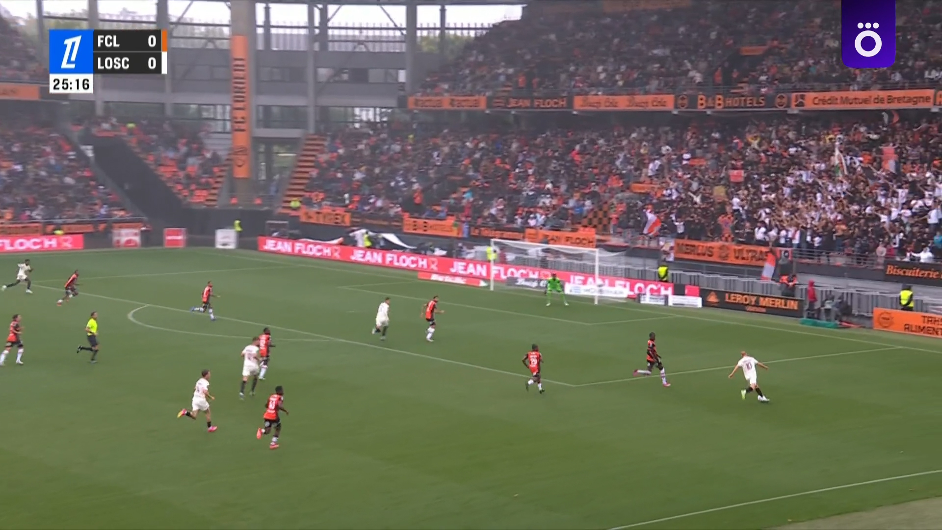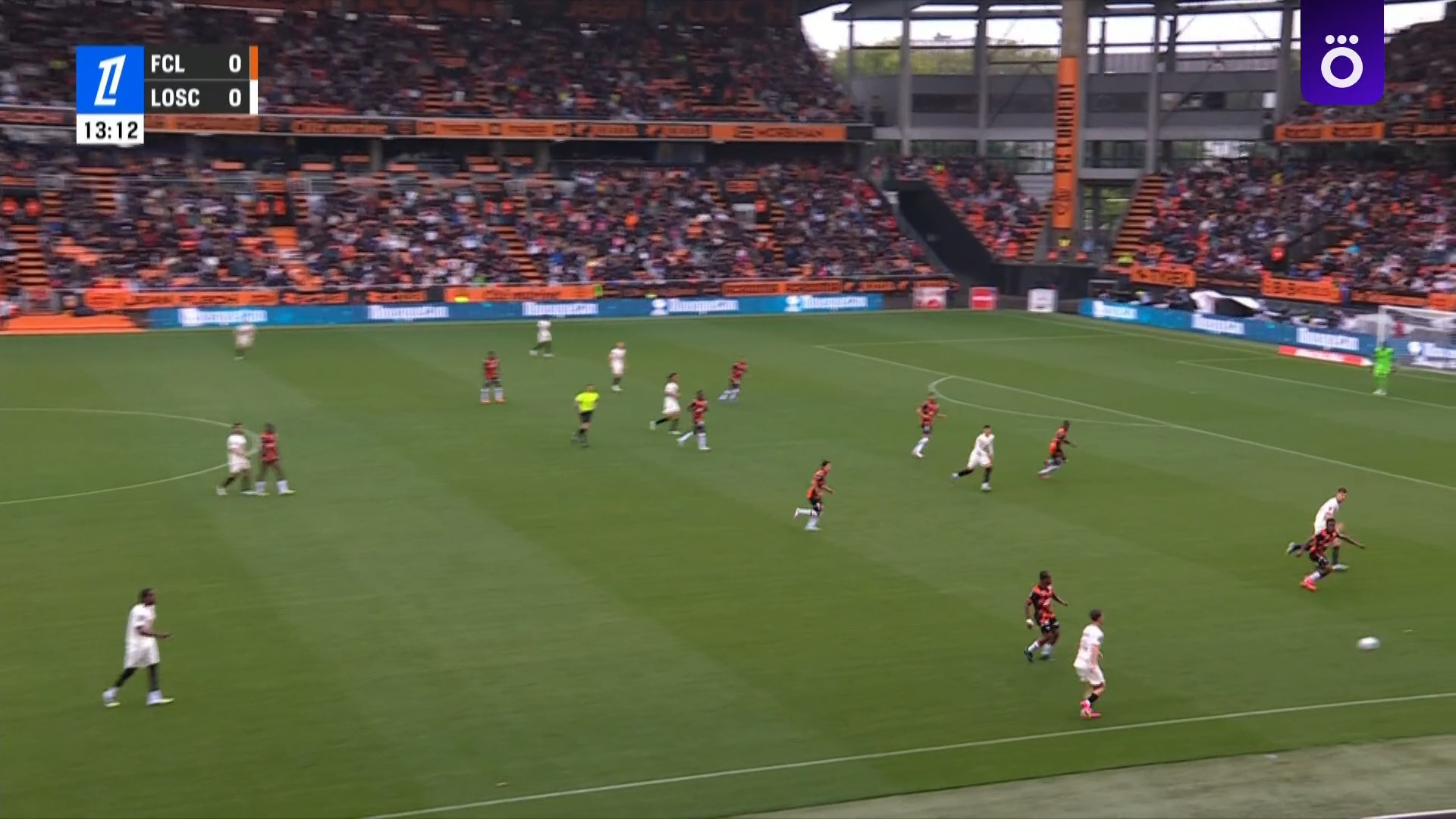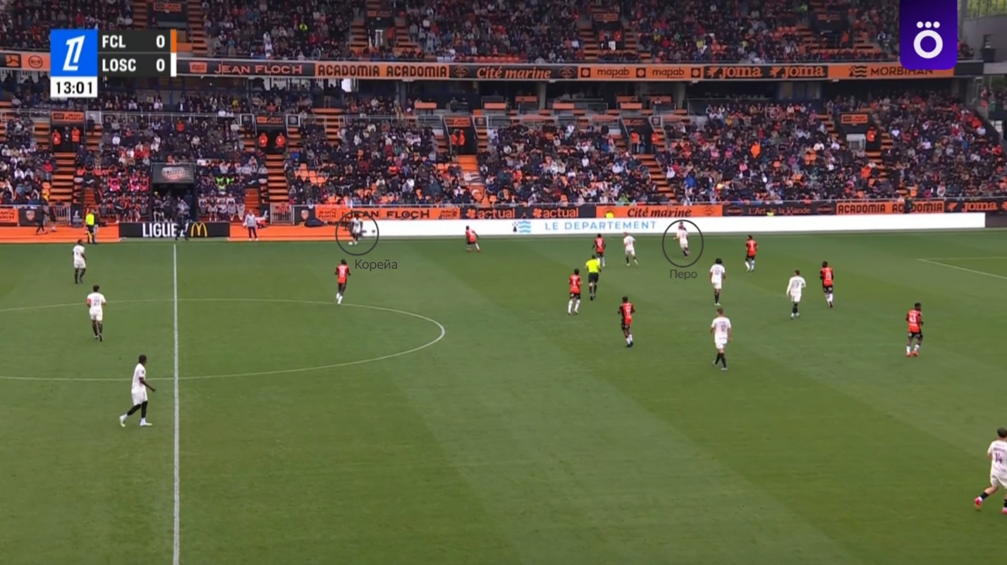 выше – первый пример из матча с «Лорьяном». по ходу игры мяч доставлялся во фланг, на котором раз за разом вингер опускался в глубину, а крайний защитник шел выше, так как в данной игре вингеры у «Лилля» были инвертированы, то при подобной ротации, вингеры оказываются в ситуации, когда стоя боком относительно ворот, они получают возможность продвинуть мяч в полуфланг, или вдоль фланга на крайнего защитника, либо перевести на противоположную сторону как на этом примере: