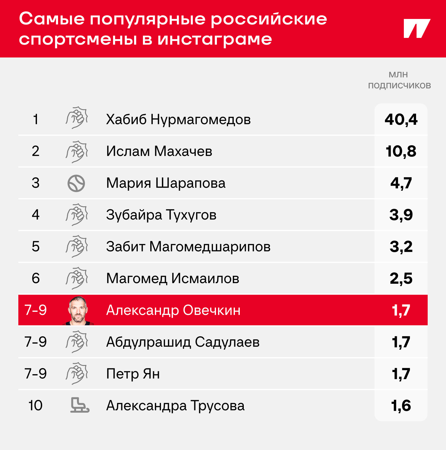 Причина, скорее всего, в не очень большой глобальной аудитории хоккея в соцсетях. По количеству подписчиков Овечкин на одном уровне с бойцами из команды Хабиба, которые даже не всегда разрывали в UFC, но в топе среди хоккеистов.