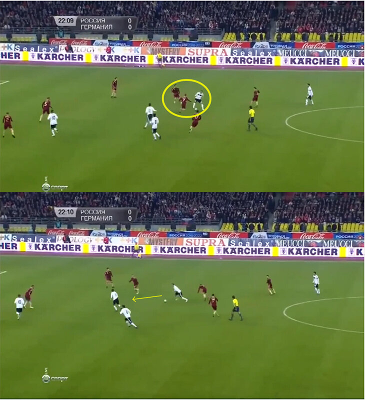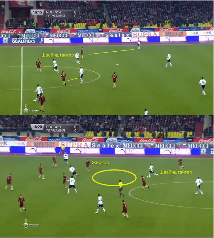 Тут Басти открылся в полуфланге и продвинул атаку на чужую треть. Игроки сборной России заняты прямыми оппонентами и не встречают. Например, на втором скрине Аршавин не смещается к немцу, а контролирует центральную ось, Зырянов спиной к мячу и следит за движением Баллака.
