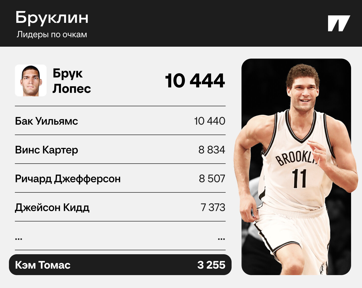● Самое низкое количество очков среди всех лучших бомбардиров франшизы – в «Бруклине» у Брука Лопеса (10 444), больше всех за один клуб набрал Карл Мэлоун в «Юте» – 36 374.