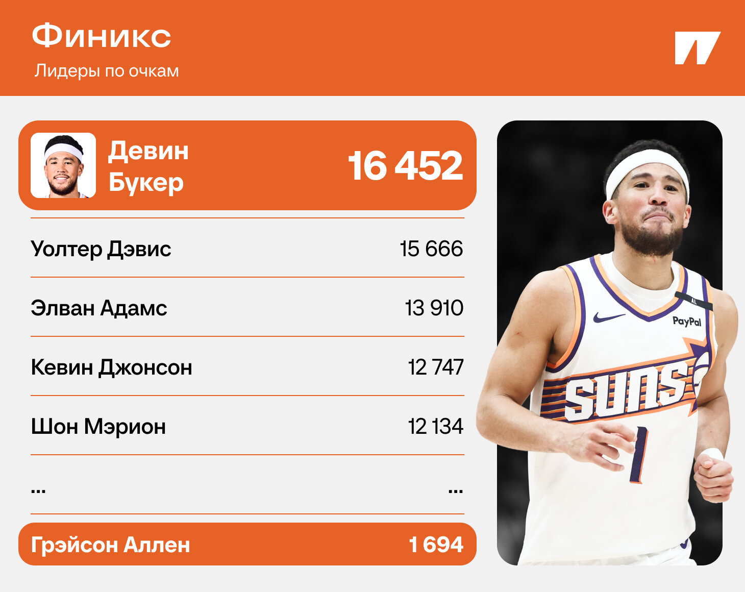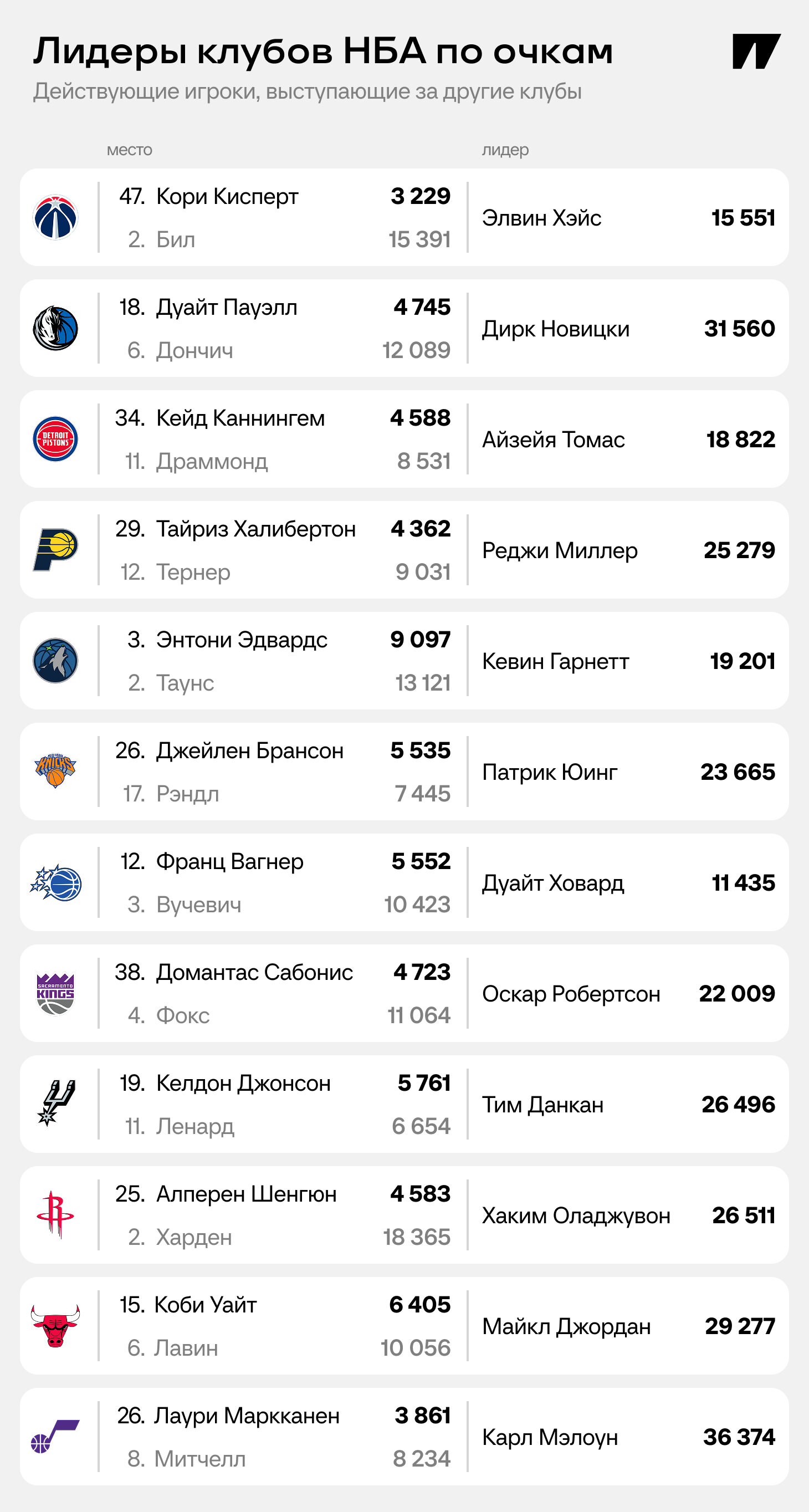 В некоторых командах текущий лидер – даже не лучший среди всех игроков НБА в 2024/25. Самый яркий пример – лишь 47-й в истории «Вашингтона» Кори Кисперт, у которого почти в 5 очков меньше, чем у Брэдли Била. При этом Бил все еще в НБА, но в другой команде. Стоит ему под занавес карьеры на бис вернуться в «Уизардс», он сместит Элвина Хэйса.