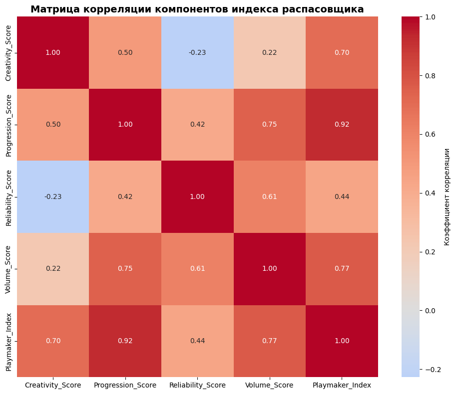 Матрица показывает, насколько каждый из четырёх компонент индекса (Креативность, Прогрессия, Надежность, Объем) взаимосвязан как между собой, так и с финальным Индексом распасовщика (Playmaker_Index). Хотя мы специально придали компонентам разные веса, с небольшим приоритетом на креативность, самым сильным драйвером итогового индекса оказалось продвижение и объем передач. Это отражает то, что продвижение и интенсивность передач оказывается ключевым фактором при прочих равных. Прогрессия и объем передач сильно коррелируют между собой. Креативность средне коррелирует с прогрессией (50%) и слабо коррелирует с объемом (22%), а с надежностью отрицательная связь (-23%).