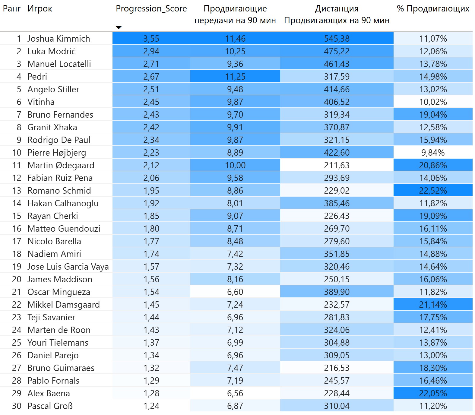 Доминирование Йозуа Киммиха. Немецкий универсал демонстрирует уникальную сбалансированность всех четырёх компонентов: 4-е место по креативности, абсолютное лидерство в прогрессии и объёме передач, при этом сохраняя высокую надежность (30-е место). Киммих — единственный игрок, который одновременно входит в топ-5 по трём из четырёх компонентов, что делает его эталонным универсальным плеймейкером.