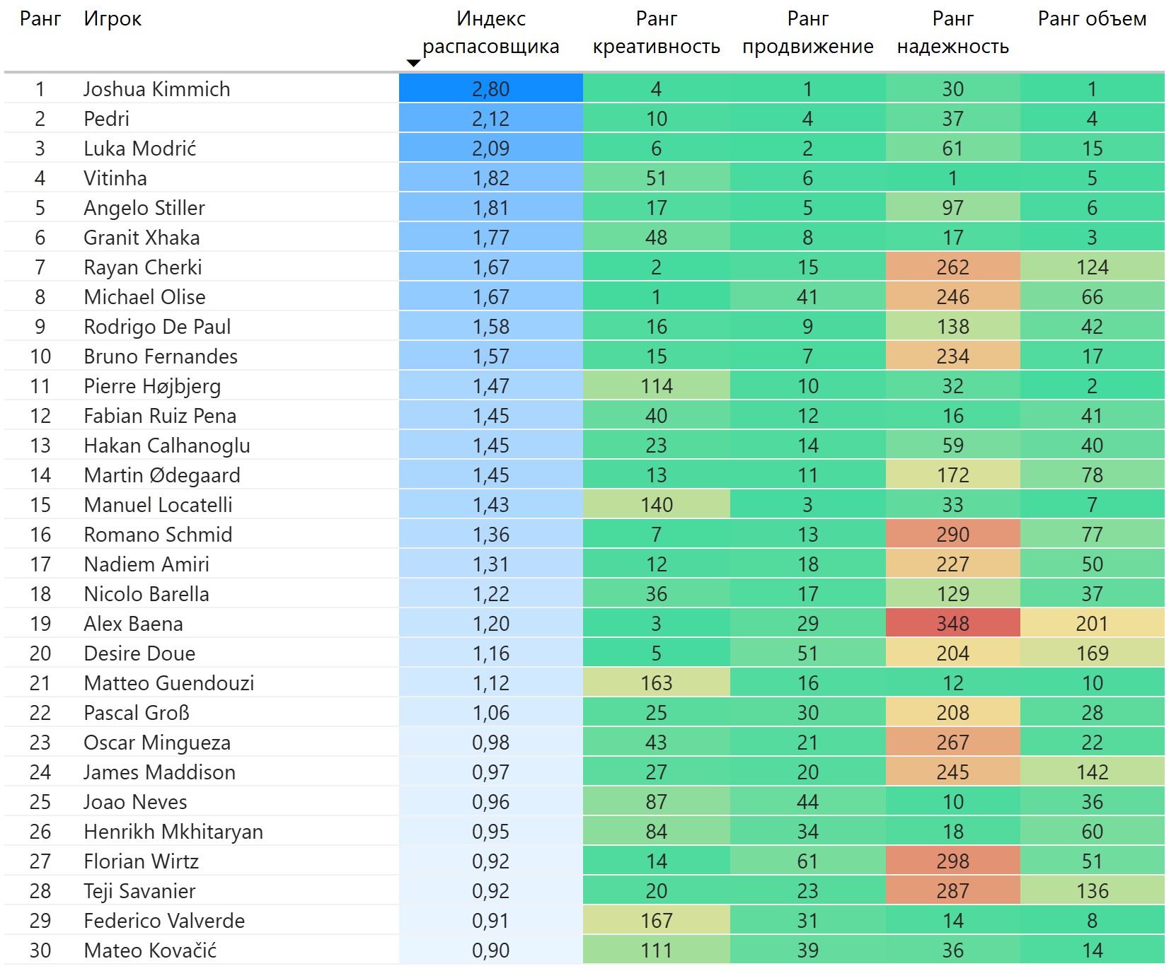 Индекс распасовщика = 0.4 × Креативность + 0.3 × Прогрессия + 0.2 × Надежность + 0.1 × Объем