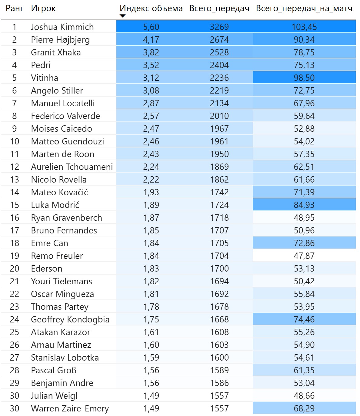 Данные компонент добавляет баллов в общем индексе тем игрокам, у кого суммарно было наибольшее количество передач за сезон. Если смотреть по количеству передач на 90 минут, то первое место также за Йозуа Киммихом, второй – Витинья, третий – Лука Модрич.