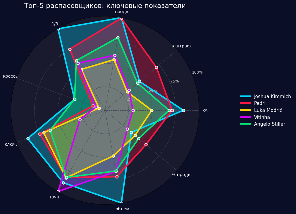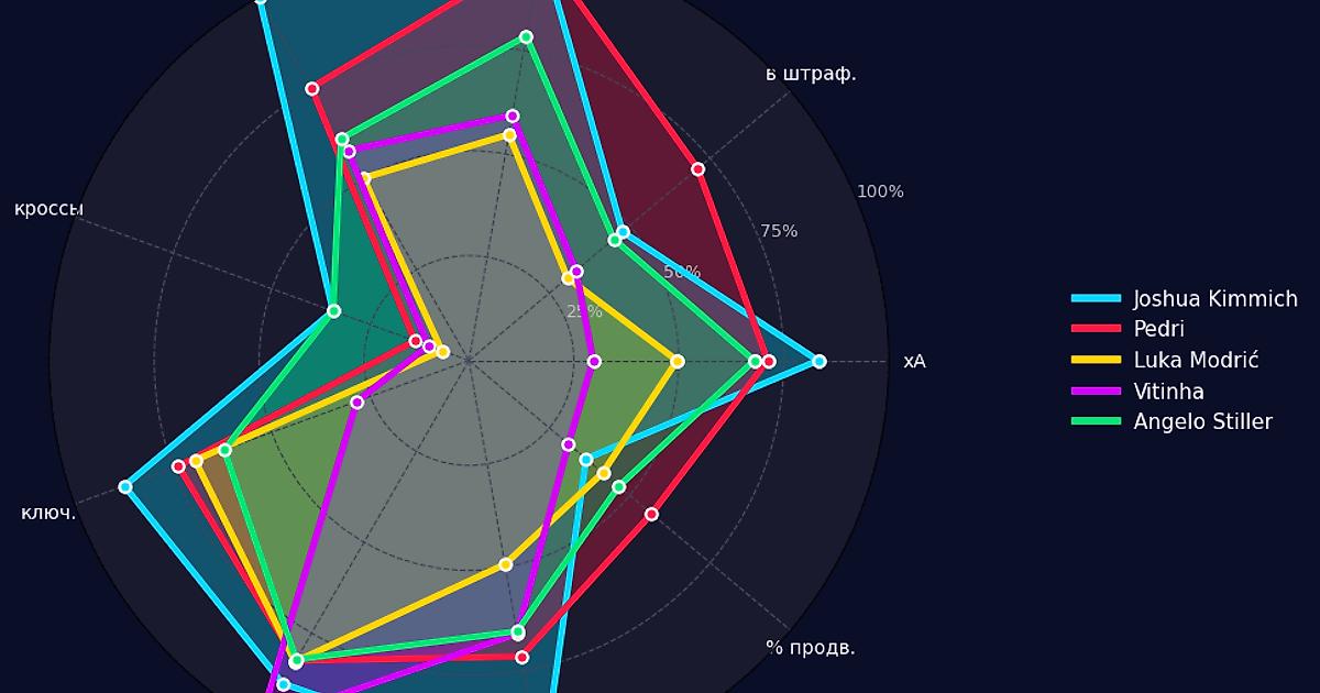 Универсалы (Киммих, Педри, Модрич) – лидеры индекса сочетают высокие показатели во всех компонентах. Педри (2-е место) и Модрич (3-е место) демонстрируют сбалансированные профили с рангами в топ-15 по трём компонентам. Педри особенно силён в прогрессии (4 место) при сохранении надёжности (37 место), в то время как Модрич второй по продвигающим передачам и 6-е место по креативности.