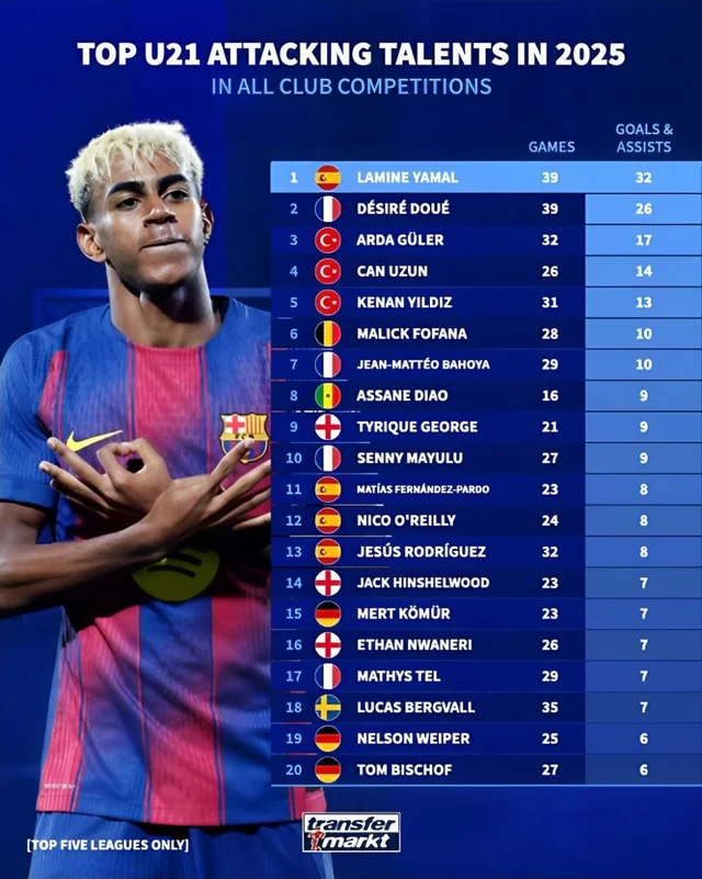 В список из двадцати лучших попали только те футболисты, кто играют в топ-5 лиг Европы. Предсказуемо первое место за Ламином Ямалем, который набрал в 39 матчах 2025 года целых 32 очка по системе «гол+пас». Это на шесть больше, чем у Дезире Дуэ из «ПСЖ».