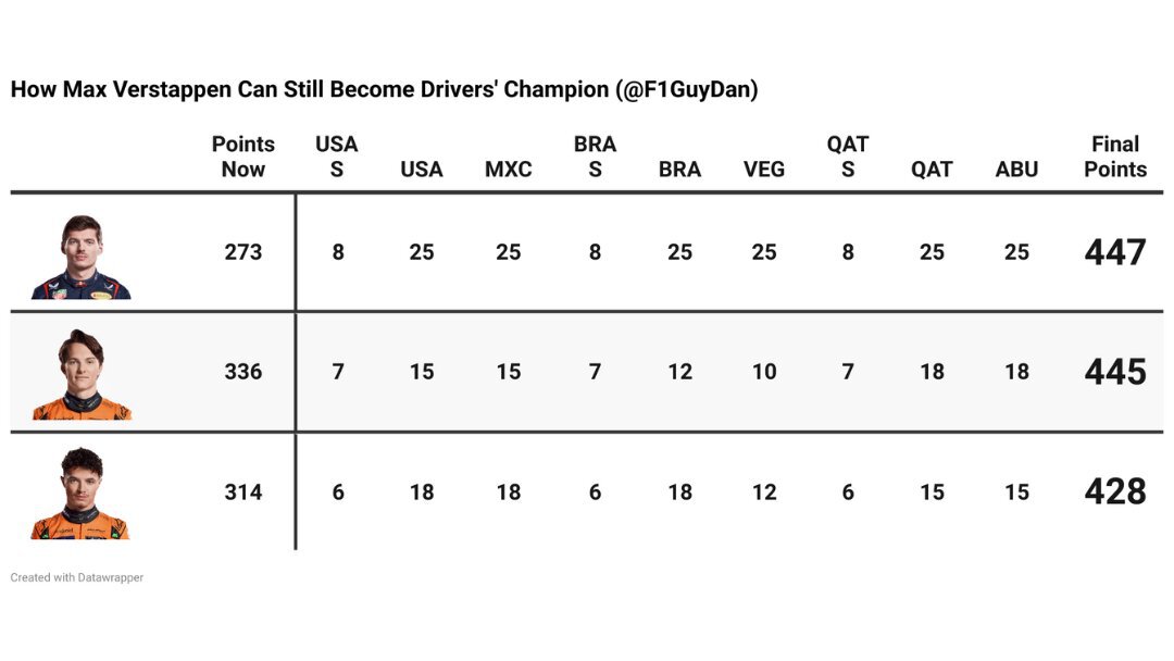 Более того, в теории Макс может забрать трофей, даже если пилоты «Макларена» не будут покидать топ-5 – без единой технической проблемы. Один из потенциальных вариантов показал пользователь соцсети X F1GuyDan: идеальные выступления действующего чемпиона, у Пиастри вторые места во всех спринтах и двух гонках, третьи – еще в двух, а также по одной четвертой и пятой позиции.