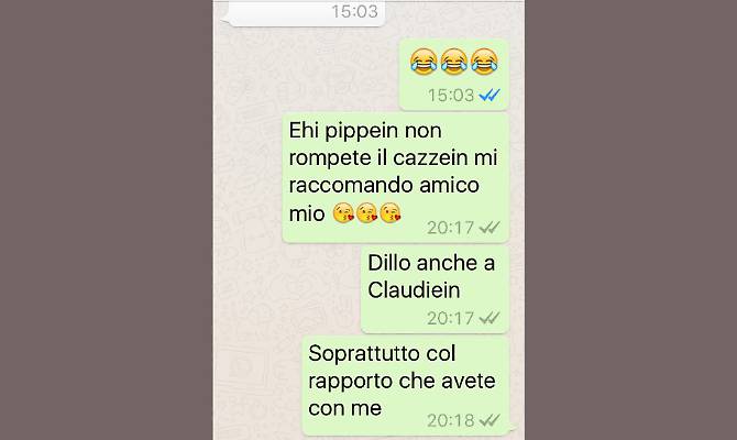 В начале недели перед матчем «Специя – Парма» именно игрок «Пармы» первым начал переписку: «Эй, Пиппо, не подведите меня в пятницу, я рассчитываю на тебя, мой друг 😘😘😘». Добавление: «Скажи это и Клаудио». Затем Калайо уточнил: «Особенно с учетом ваших отношений со мной».