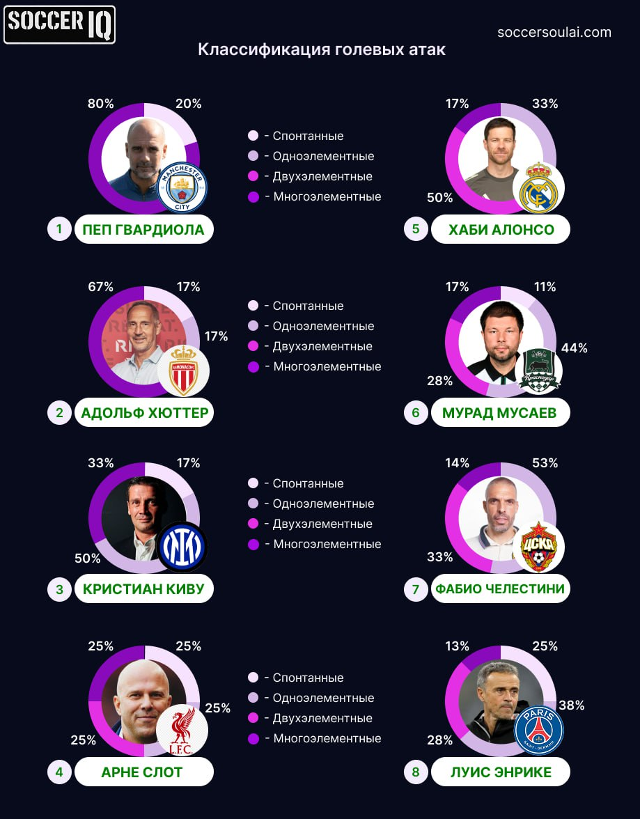 Сложные ситуации у команды дают результат, но это не самая сильная сторона, как количественно, так и в процентном отношении. Тем не менее, перед нами образец команды с довольно разнообразными возможностями, как в отношении типологии, так и классификации атак.