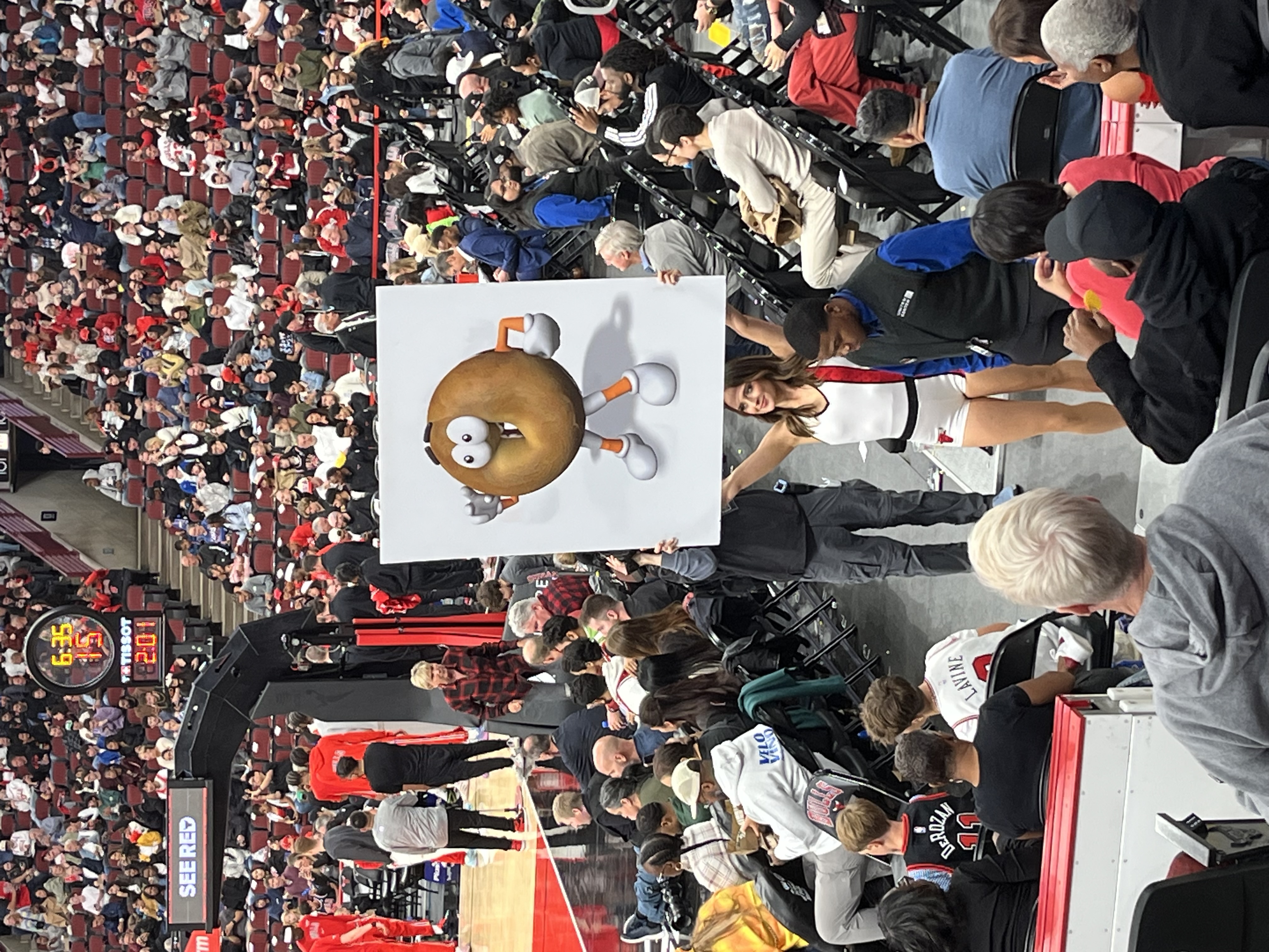 Когда я уже заскучал (матч показался мне несколько монотонным), вышел маскот Бенни с кольцом и мячом – предлагал зрителям попасть в цель. Каждое успешное попадание вызывало такой шум на трибунах, что стало понятно, что заскучал не я один.