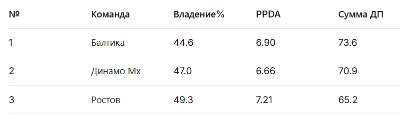 Далее список команд, которые много владеют мячом, активно прессингуют соперника (низкий PPDA) и предпочитают контролировать мяч через короткий и средний пас, что подтверждается низкой суммой длинных передач. Это команды, которые стремятся полностью контролировать игру.