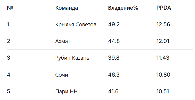 Начнем с команд склонных отдавать инициативу сопернику (низкое владение) и не склонных к активному агрессивному прессингу.