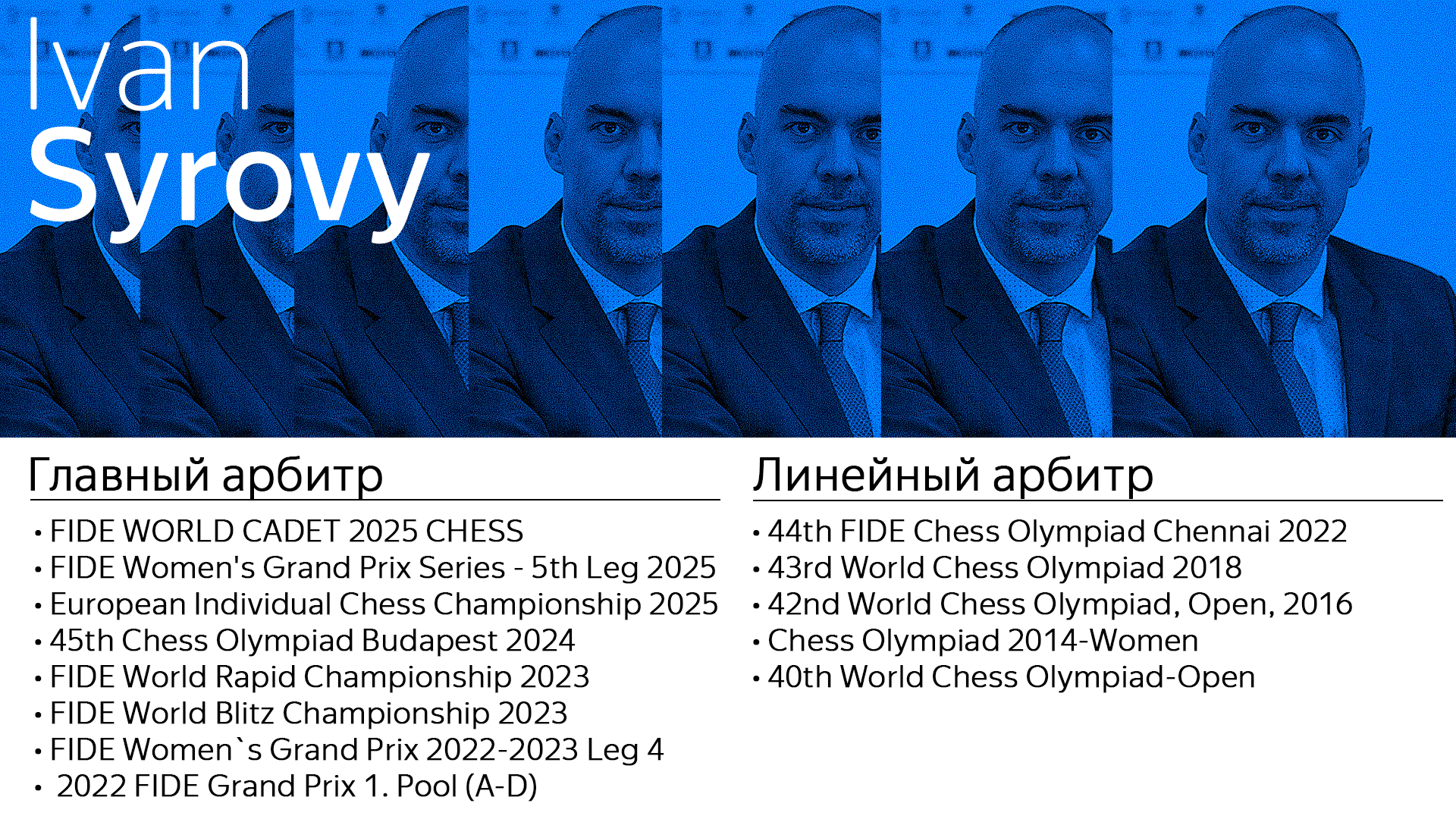 У Вас за плечами блестящая карьера: Вы были главным судьёй на 4-ом этапе женского гран-при FIDE 2022-2023, 1-м турнире гран-при FIDE (группы A-D), юношеском чемпионате Европы 2019, чемпионате мира IPCA среди лиц с поражением опорно-двигательного аппарата в 2018 и 2019 гг. и на юношеской олимпиаде по шахматам.