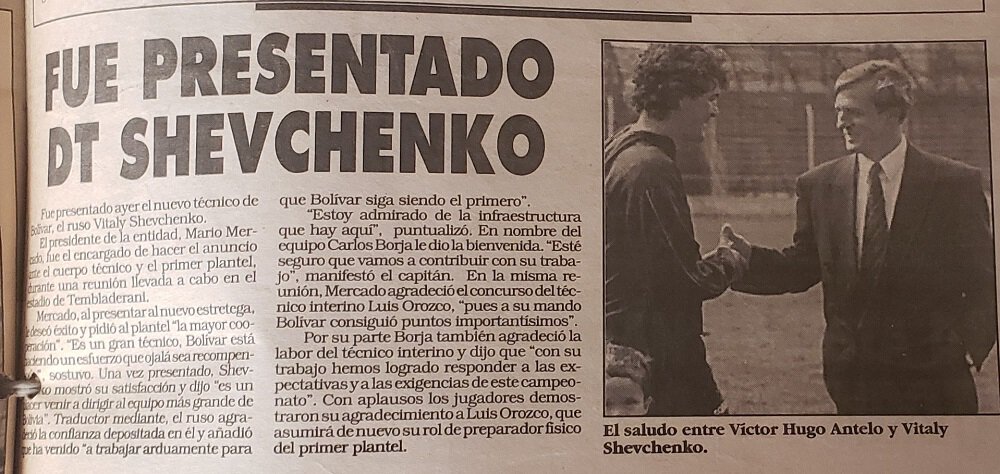 Меркадо представил Шевченко игрокам «Боливара» 30 августа 1992-го. Президент призвал команду во всем прислушиваться к Виталию Викторовичу и добавил: «Он отличный тренер. «Боливар» приложил огромные усилия, чтобы заполучить его. Надеюсь, наши усилия будут вознаграждены».