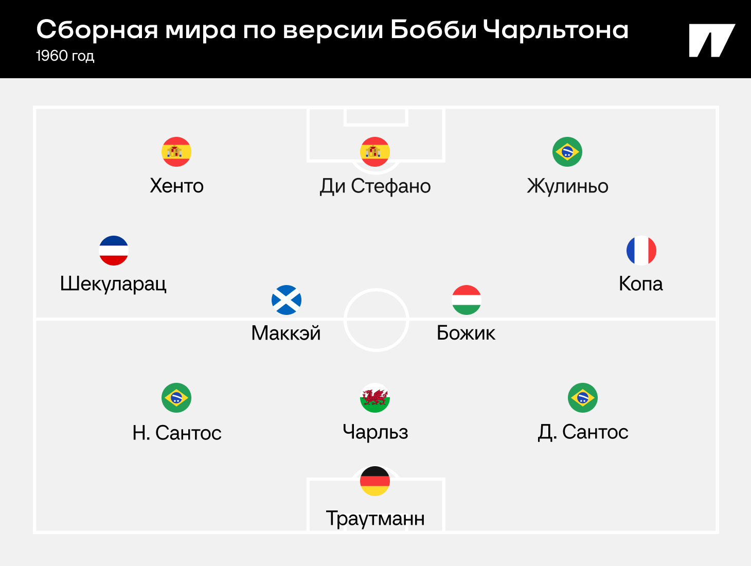 Чарльтон намеренно не включил в команду игроков из «МЮ», чтобы сохранить больше объективности. И да, здесь нет многих из привычных нам звезд эпохи: Пеле, Гарринчи, Ференца Пушкаша, Льва Яшина.