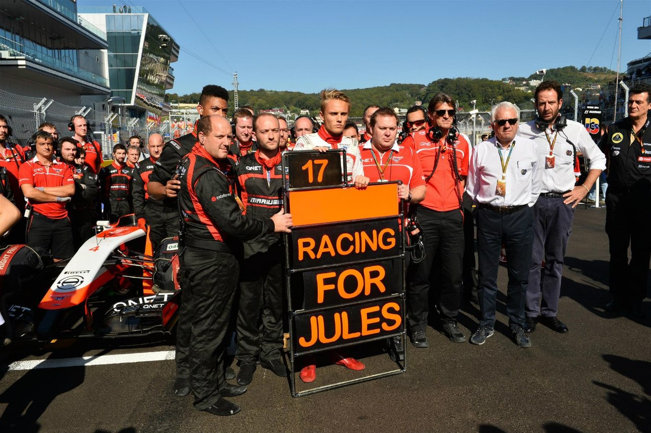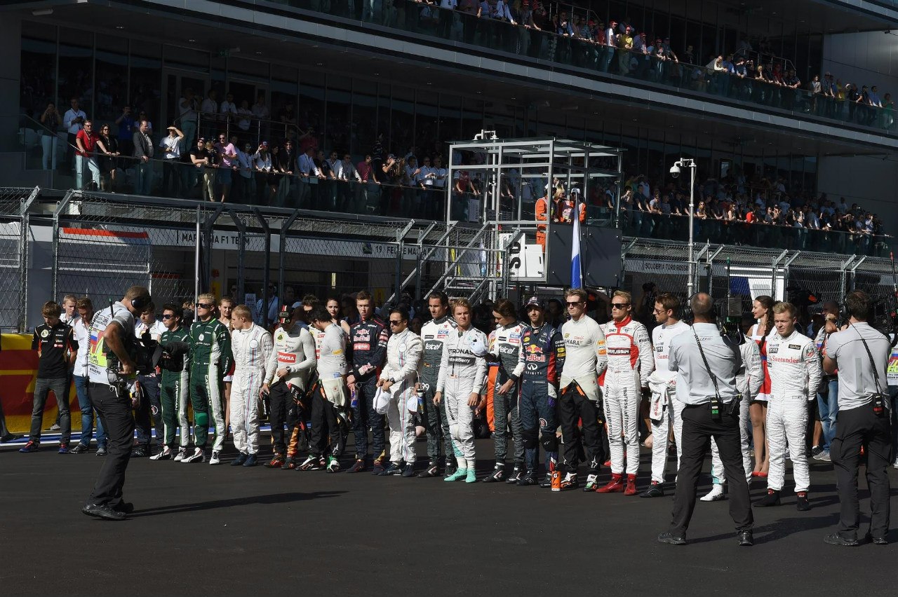 Гонщики проявили настоящее «пилотское братство», встав в круг перед стартом. А на телетрансляции зрители увидели надпись «Jules, we are all supporting you». Напомню, что 5 октября на гран при Японии незадолго до уикенда в России, Жюль Бьянки попал в серьезную аварию. Болид на 43 круге не справился с управлением и врезался в гусеничный кран. Пилот скончался в 2015 году от тяжелых травм головы.