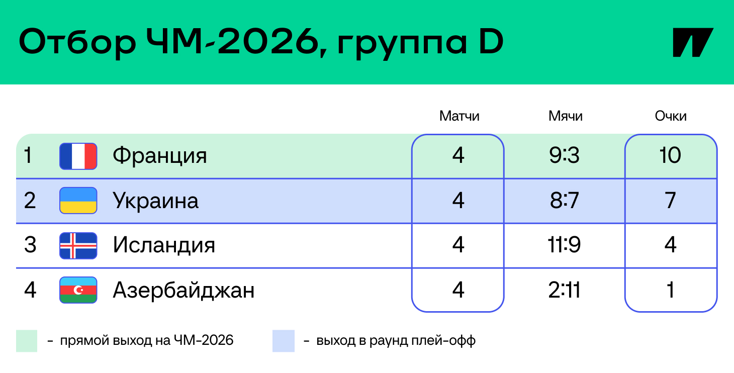 По итогам трех туров Франция набрала девять очков, Украина – четыре, Исландия – три, Азербайджан – одно.