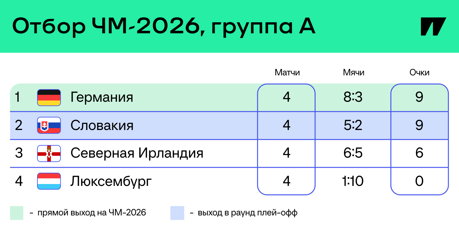 Немцы не пропустили на выезде впервые с весны 2024-го, когда победили Францию, хотя хозяева били даже чаще их (12:10). А еще Германия выиграла 11-й подряд матч у североирландцев.