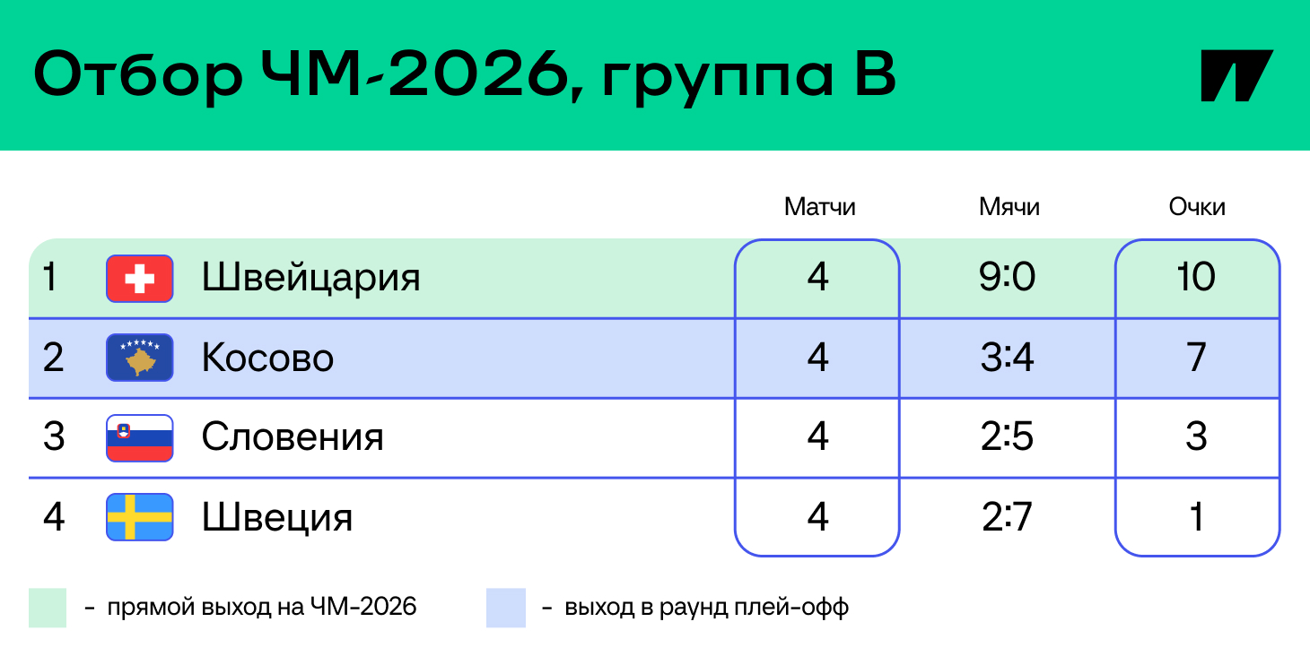В ноябре пройдут оставшиеся два тура. 15-го Швейцария сыграет дома со Швецией, а Словения – с Косово. 18-го состоятся матчи Швеция – Словения и Косово – Швейцария.