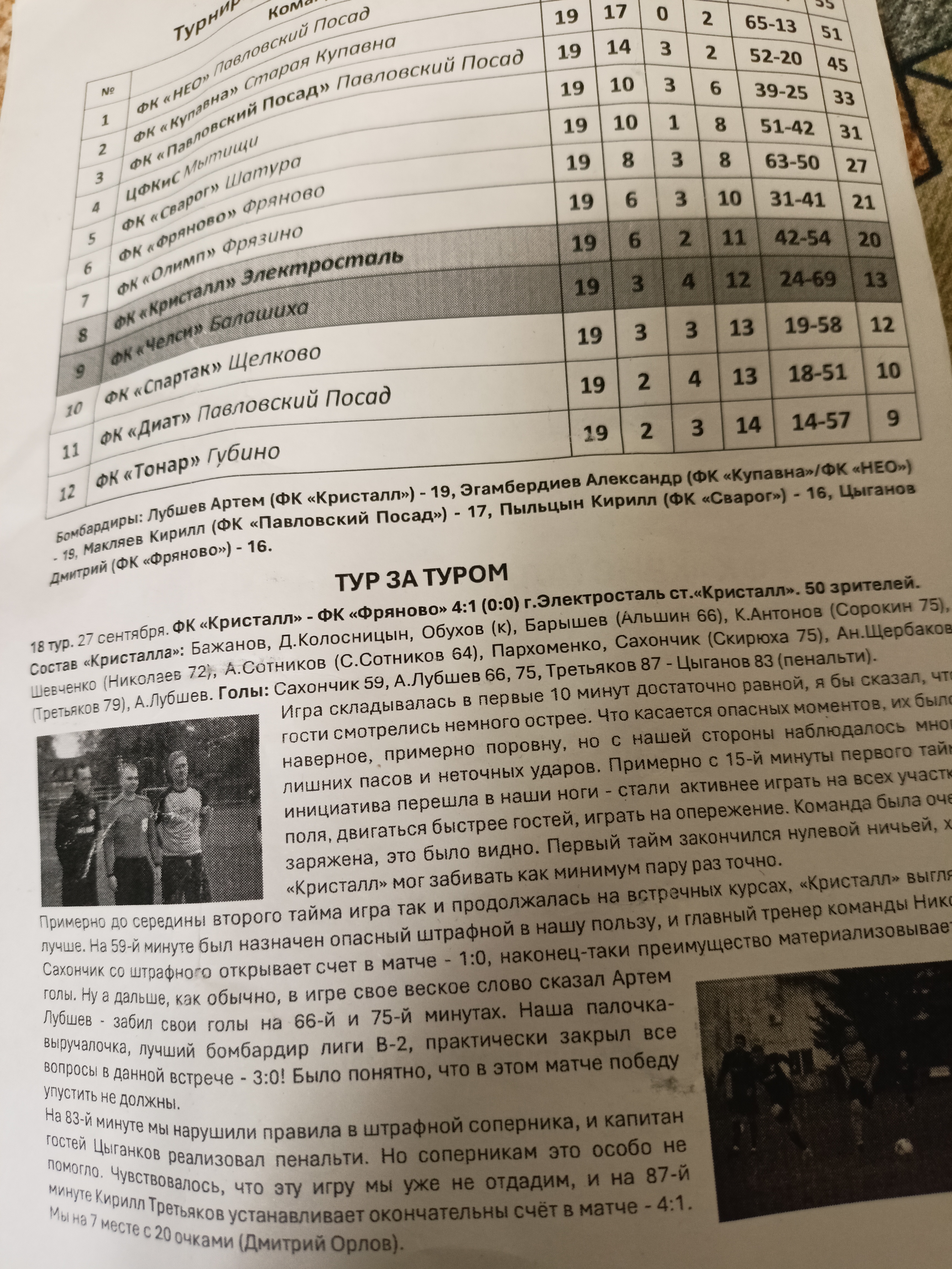 Замечательный парень и админ странички «Кристалла» Александр Маякин, по собственной инициативе готовит программки к матчам. И в очередной раз упомянул в ней меня, Вашего покорного слугу))
