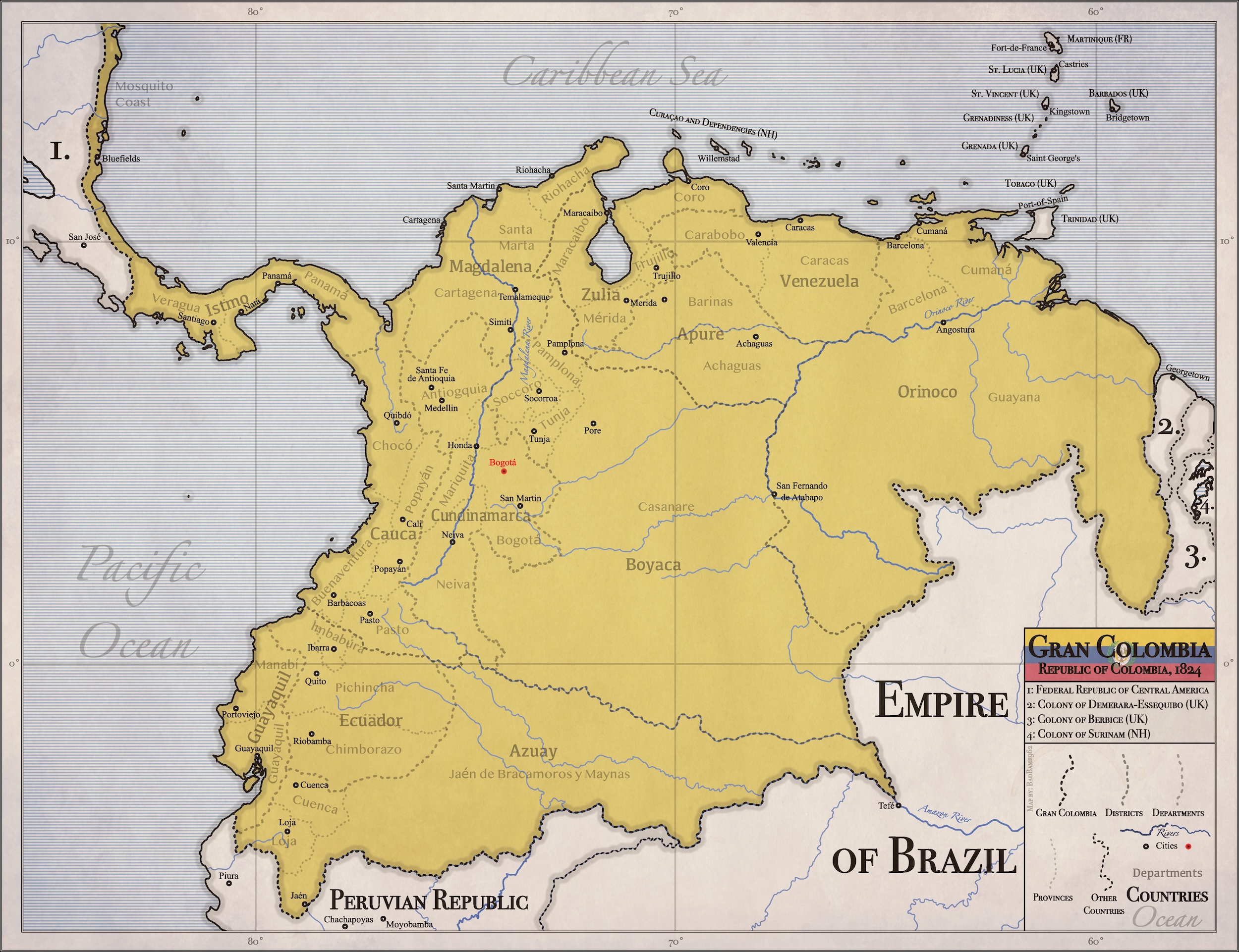 Новое государство должно было объединить все колонии в Центральной Америке – современные Панаму, Венесуэлу, Эквадор и, собственно, Колумбию. Сам Боливар стал президентом и вновь получил диктаторские полномочия, но на этот раз не жестил, а предпочитал более точечные репрессии. Зачастую против вчерашних союзников – республиканцев, которые требовали демократизации.