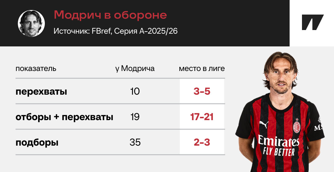 Уже сейчас, даже на короткой дистанции, видно, как сильно Модрич влияет на атаку «Милана» на уровне лиги. У него гол и один ассист, он входит в топ-10 по передачам под удар и предударным действиям, а по продвигающим пасам в Серии А уступает только Николо Барелле (49 перед этим туром чемпионата).