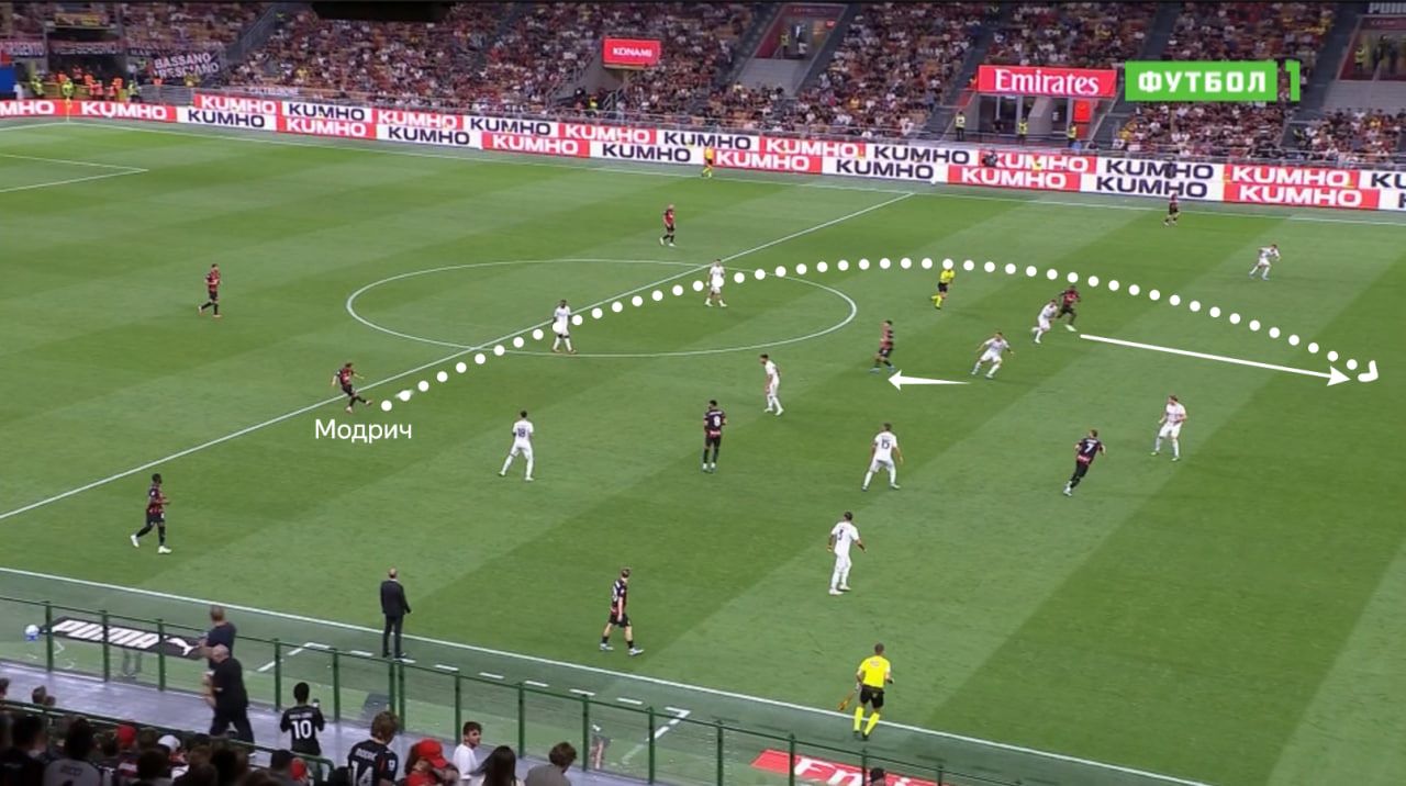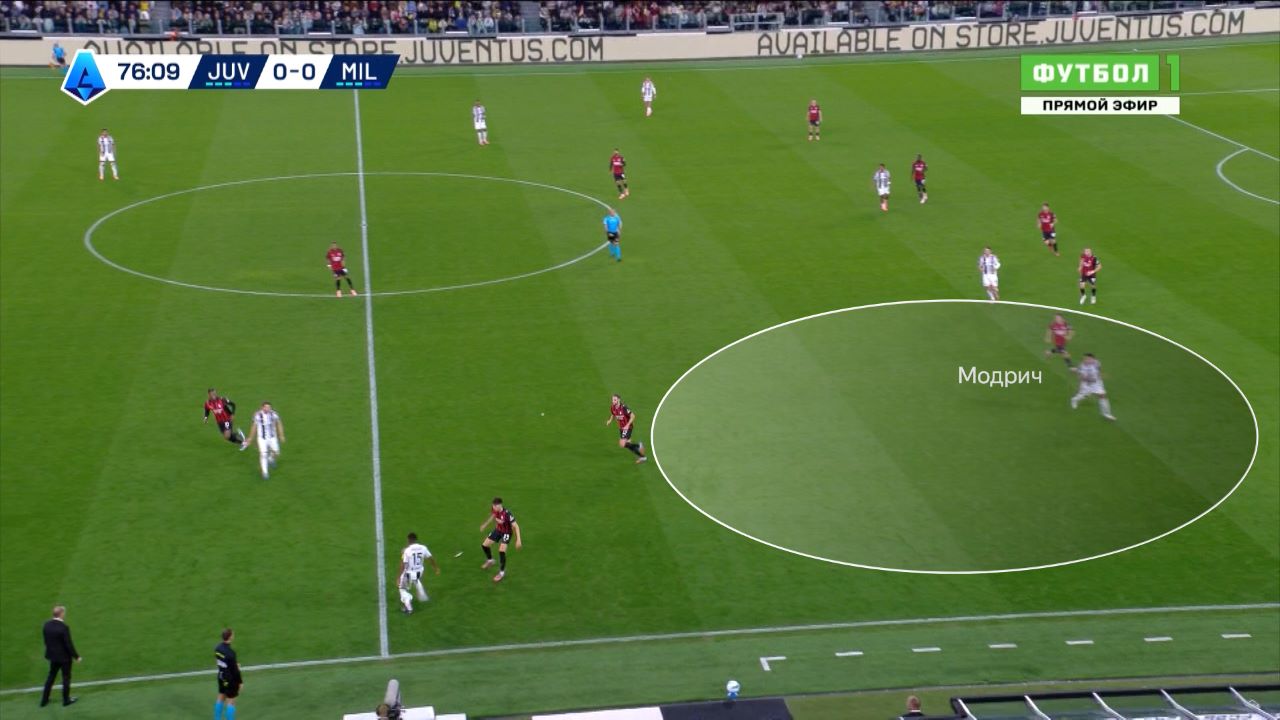 Выделяются моменты, когда «Милан» преодолевает высокий прессинг. Модрич уверенно чувствует себя под давлением и хладнокровно разбирается даже под плотной опекой.