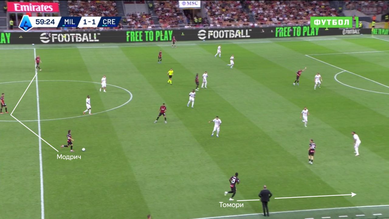 Против «Кремонезе» хорват опускался правее в тройку на место Фикайо Томори, а защитник подключался выше и вносил элемент хаоса. Лука же получал мяч в удобной позиции лицом к воротам и высматривал потенциальные варианты для паса.