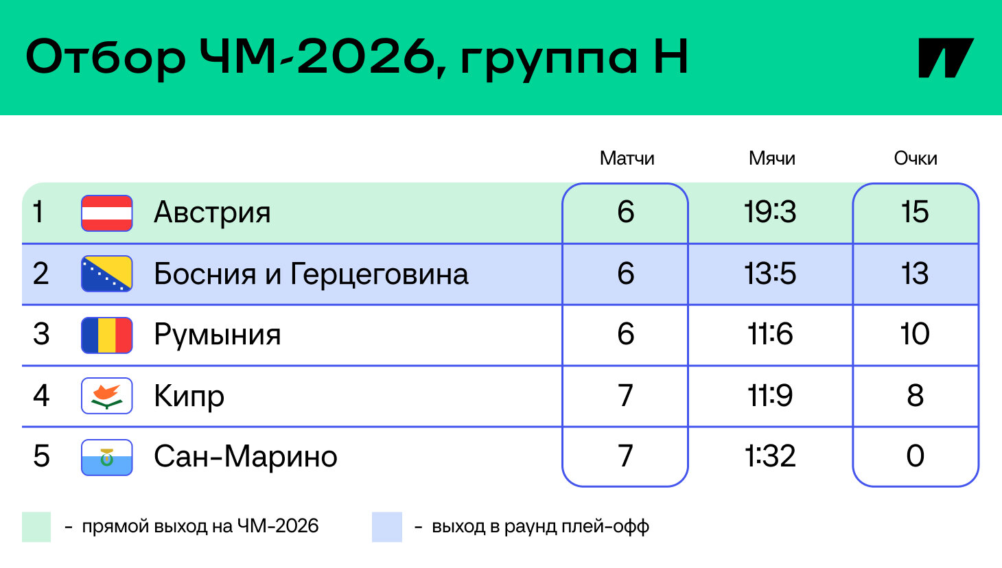 У румынов осталось два матча в отборе. Сначала в гостях против прямого конкурента за второе место в группе – с Боснией и Герцеговиной, а в последнем туре – против Сан-Марино дома. У боснийцев в последнем туре будет выезд к Австрии. Шансы у румынов неплохие, а в случае равенства очков будут смотреть на разницу голов.