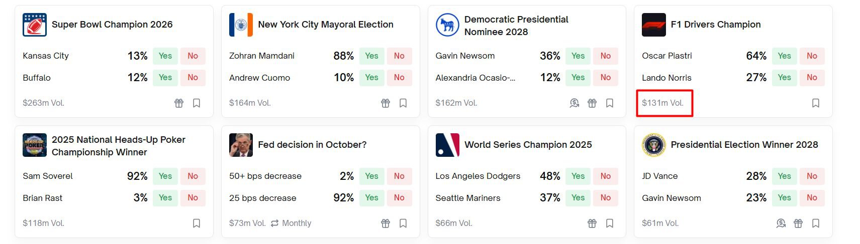 На американской бирже прогнозов Polymarket внезапное: рынок на «Формулу-1» загадочно вырос и вошел в топ-5 самых популярных.