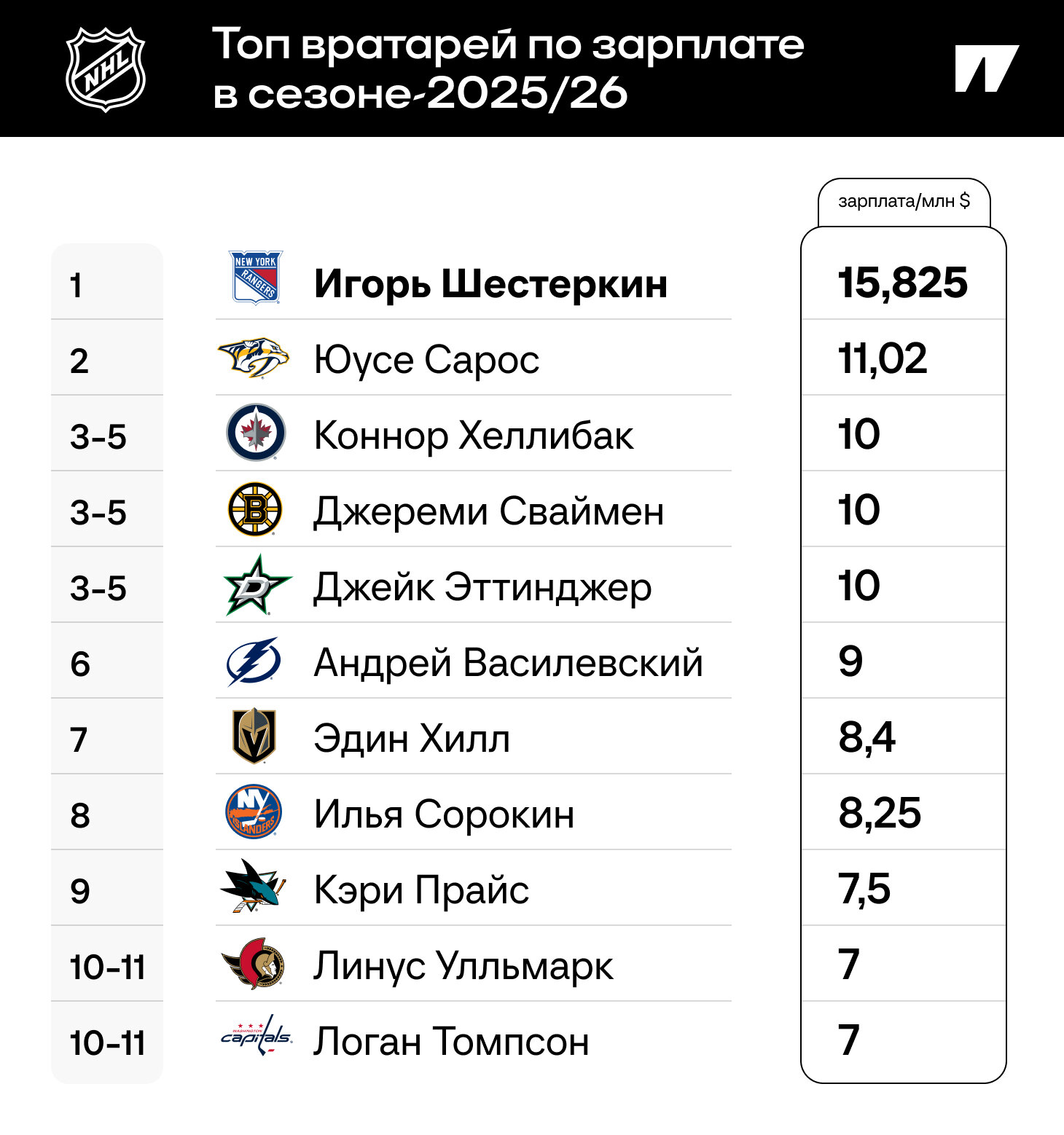 ● Элиас Петтерссон, Эрик Карлссон и Вильям Нюландер также сохранили места в топе, но с последними двоими поравнялся одноклубник Панарина и новый самый дорогой вратарь в истории хоккея – Игорь Шестеркин. В начале прошлой регулярки голкипер подписал восьмилетний контракт на $92 млн и опередил Кэри Прайса, единственного на тот момент вратаря с зарплатой больше 10 млн в год. Сезон для Игоря вышел неровным, но штормило всю команду – «Рейнджерс» даже не попали в плей-офф. Теперь россиянину нужно доказывать, что ему неспроста выписали такой чек.