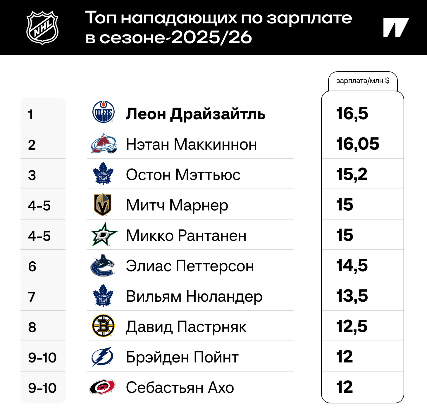 ● Лидер вновь сменился: теперь это Леон Драйзайтль из «Эдмонтона». Год назад он был далеко за пределами топ-10, а с этого сезона зарабатывает в среднем по $14 млн в год. Правда, на вершине он пробудет всего один чемпионат – из-за суперконтракта Капризова, но в тройке останется.