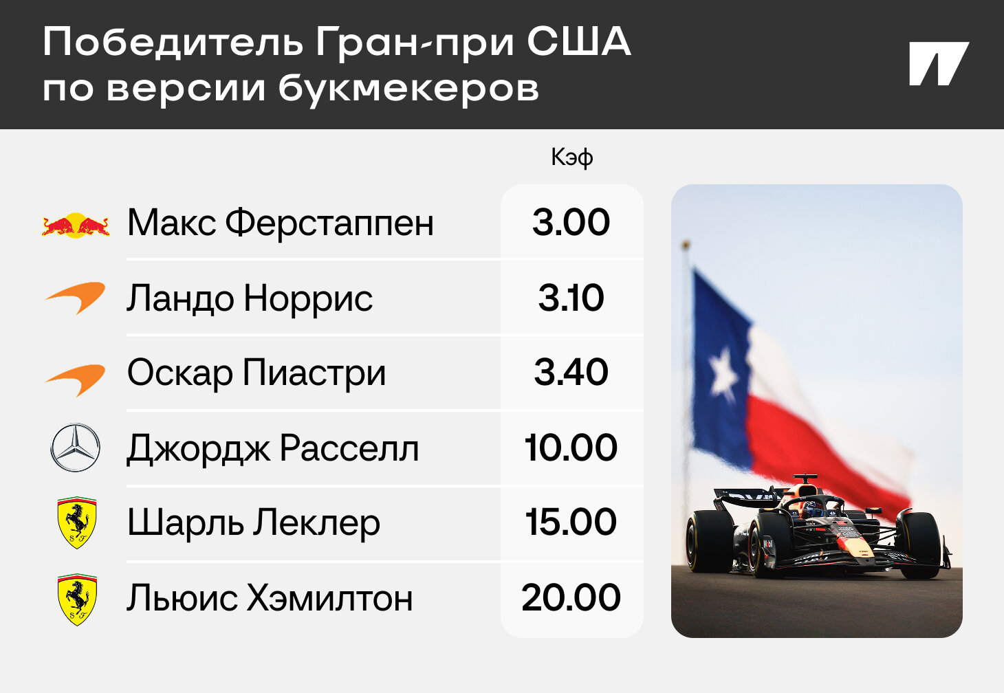 Оскар Пиастри все еще стоит главным фаворитом в линии. В то же время теоретически лидер чемпионата может смениться уже после гонки в Техасе – будет достаточно схода австралийца и победы Ландо Норриса.
