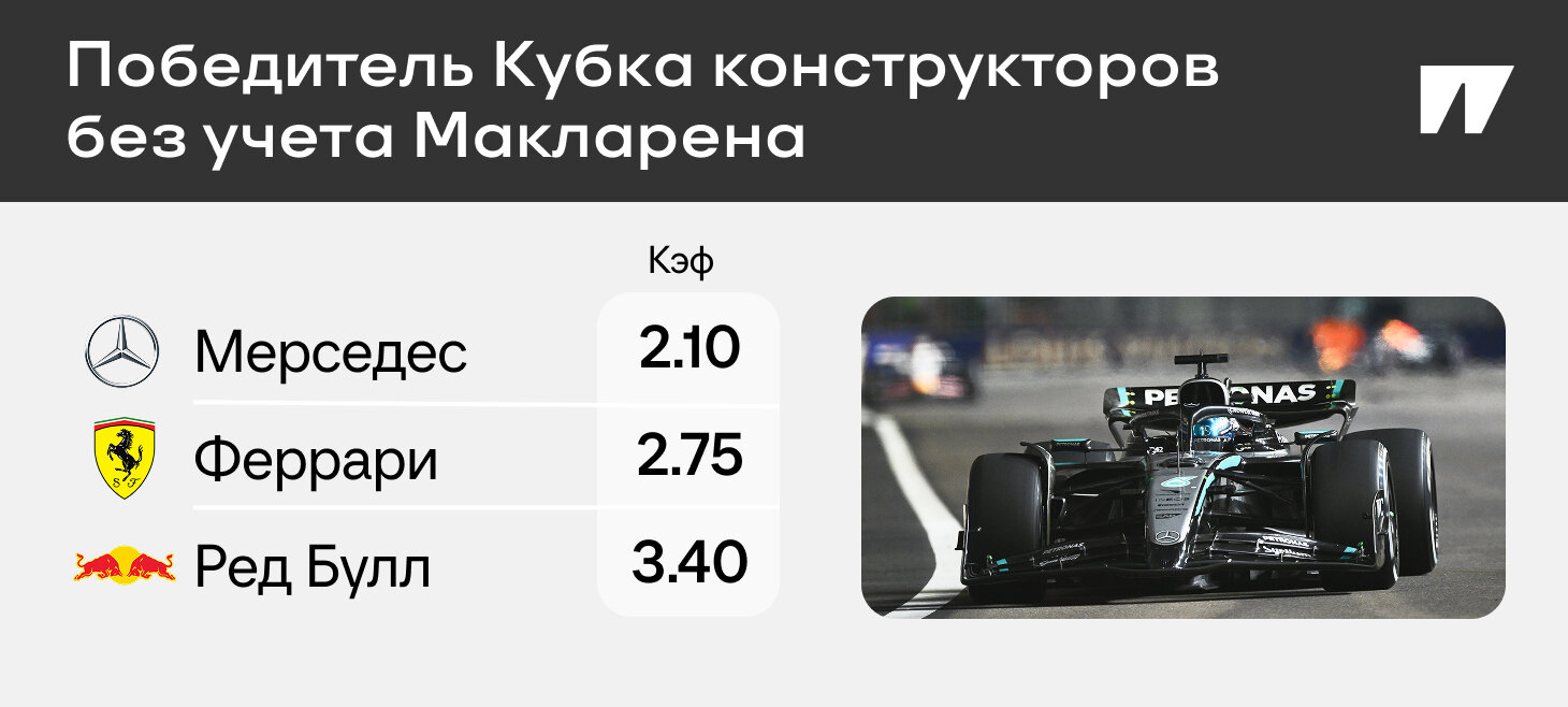 Британская команда официально забрала трофей в Сингапуре. Впрочем, у букмекеров линии на победителя не было уже летом. Теперь все внимание – борьбе за вторую позицию. Тут все непредсказуемо даже для аналитиков. «Ред Булл» не списывают, хотя команда почти всегда может рассчитывать на очки только от одного пилота.