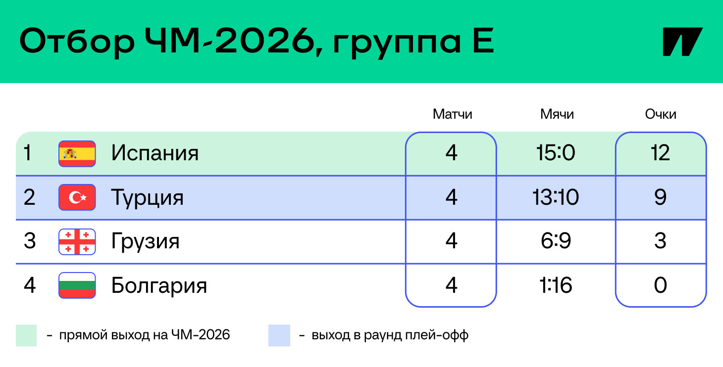 В группе осталось четыре матча. 15 ноября: Турция – Болгария и Грузия – Испания. 18-го: Болгария – Грузия и Испания – Турция.