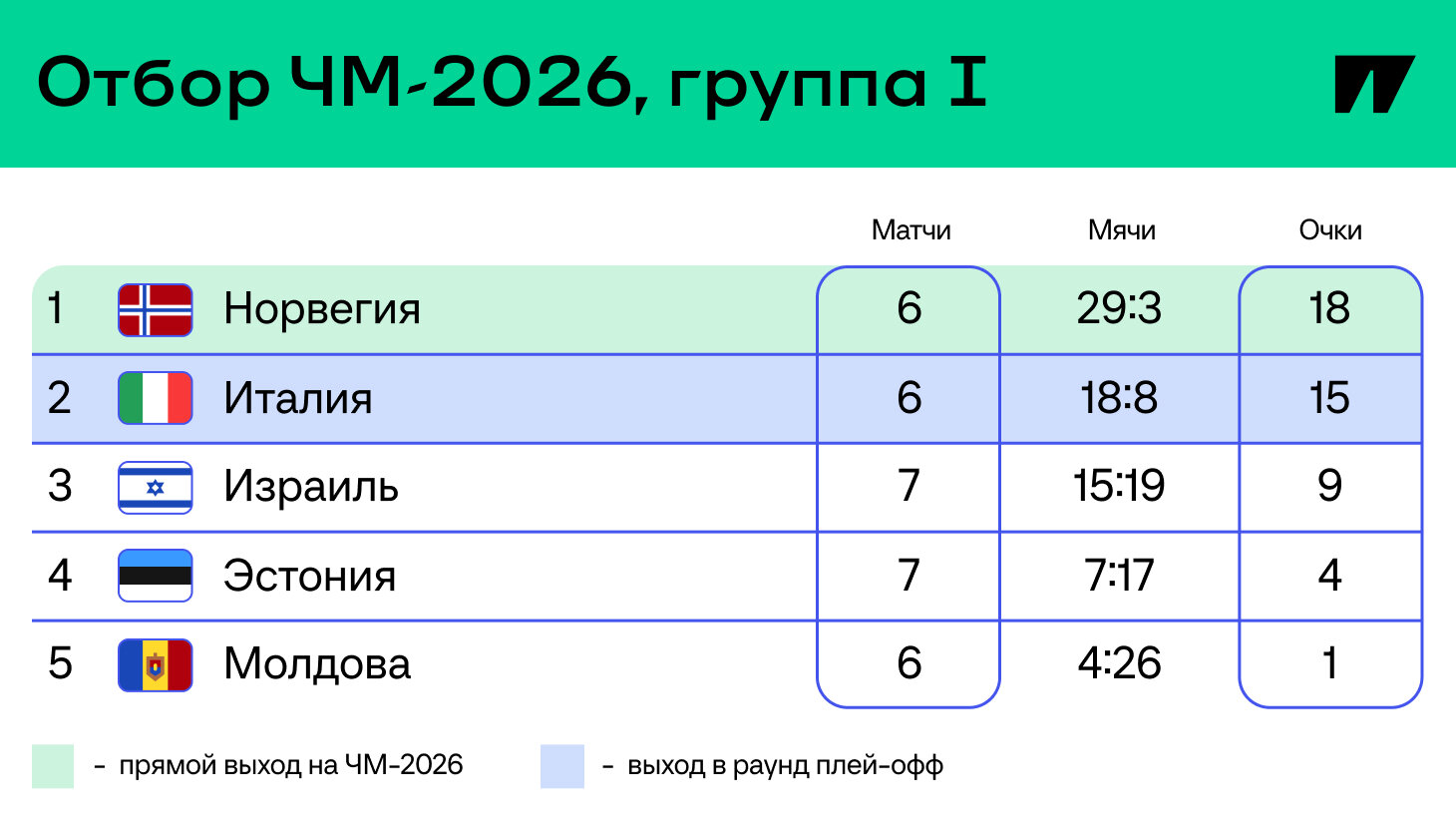Норвегия шла первой с 18 очками в шести играх, Италия – с 12 в пяти, дальше – Израиль с девятью в шести. Эстония и Молдова отстали (три и ноль очков).