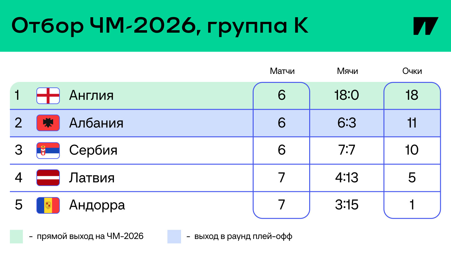 Перед матчами Англия лидировала с 15 очками в пяти играх, дальше шла Албания с 11 в шести. У Сербии семь очков в пяти матчах, у Латвии – пять в шести, у Андорры – одно.