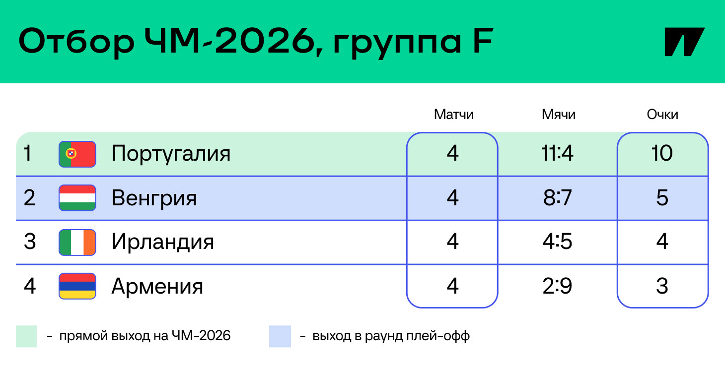 Через месяц пройдут оставшиеся четыре матча. 13 ноября: Армения – Венгрия и Ирландия – Португалия. 16 ноября: Венгрия – Ирландия и Португалия – Армения.