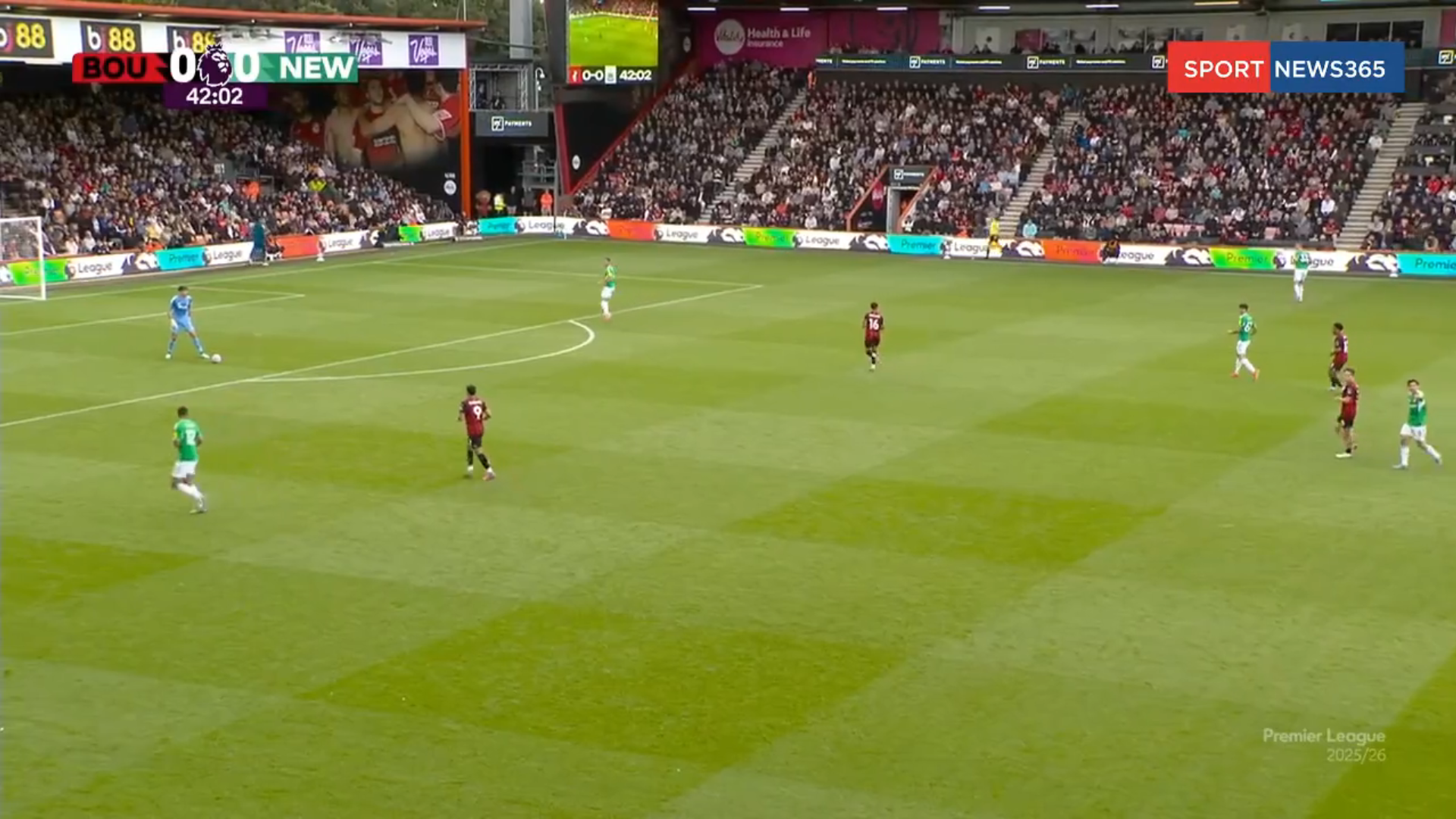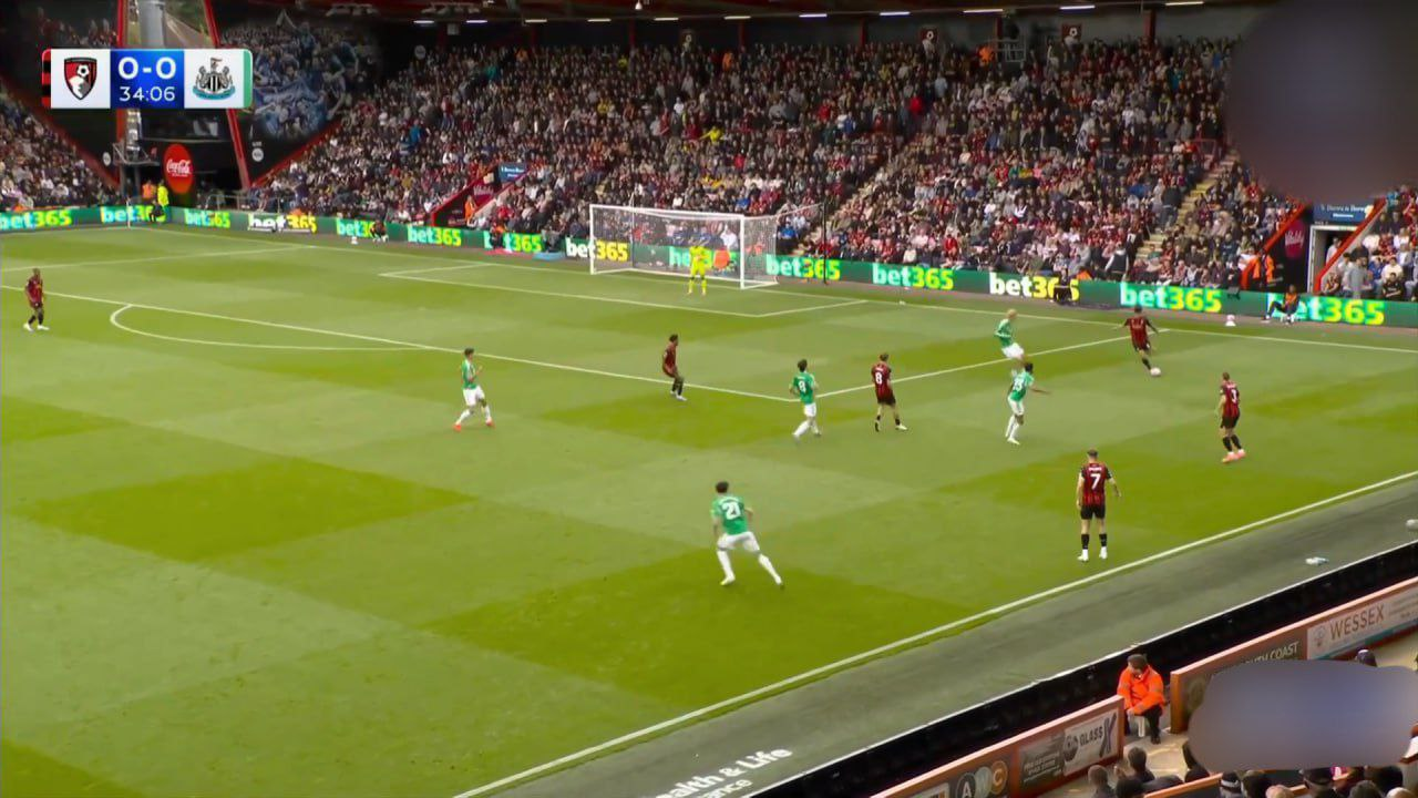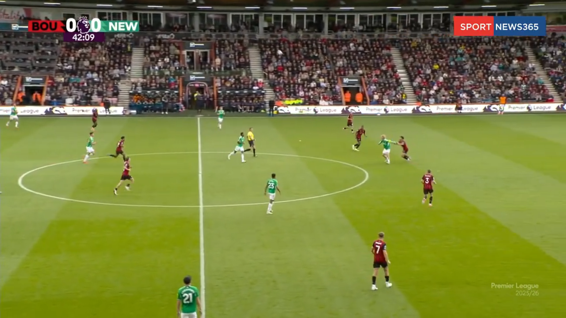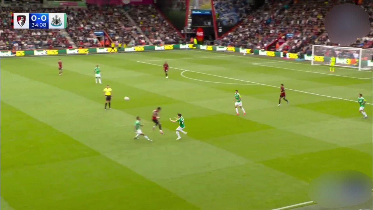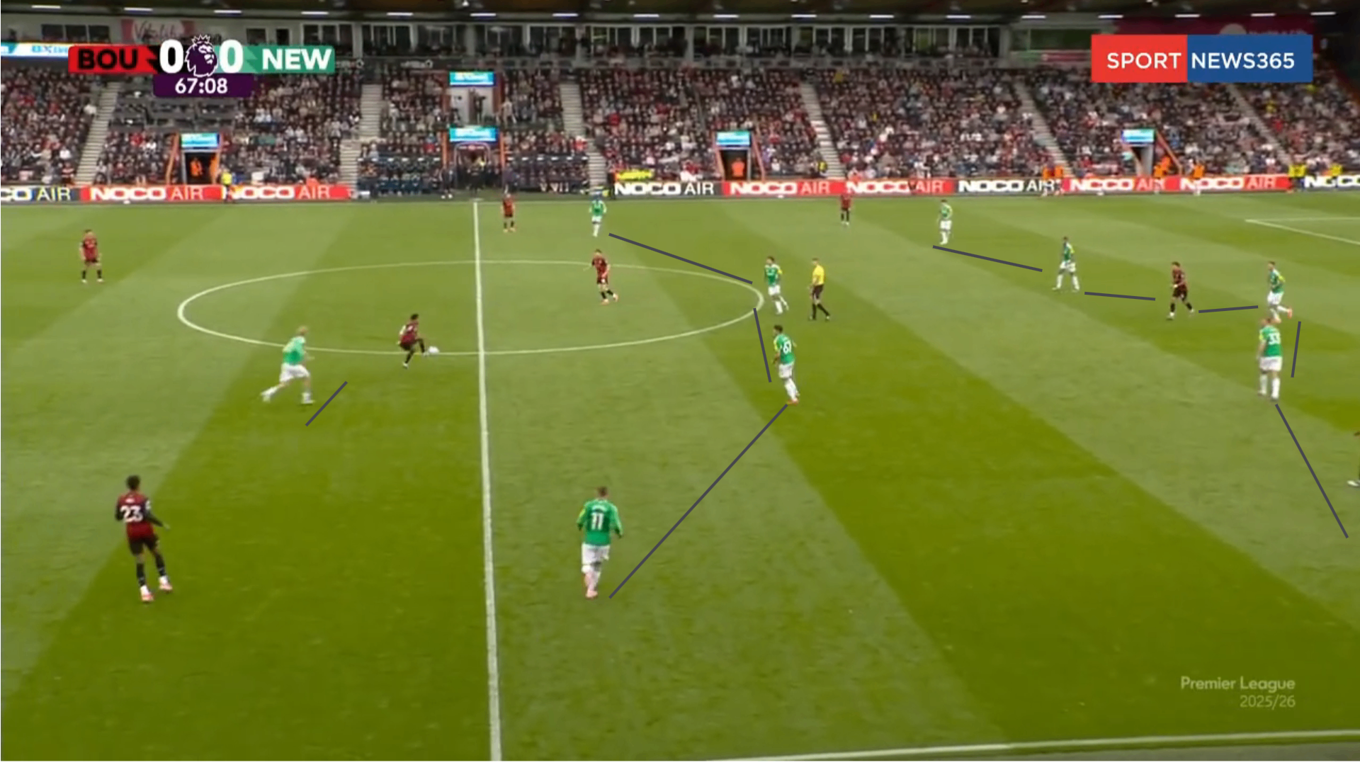 Три цз помогут разбить прессинг «Борнмута», и понизить значимость длинных передач. «Борнмуту» будет сложнее нас запрессинговать, доказано «Ньюкаслом» и «Кристалл Пэлас». Они регулярно проходили прессинг «Борнмута» за счет свободного центрального защитника или игрока центра поля. «Борнмут» попробовал изменить структуру прессинга. Семеньо давил на третьего цз, а правый защитник «Борнмута» противостоял латералю «Ньюкасла». Однако из этого мало что вышло, потому что Антуану было непривычно прессинговать в новой для себя зоне, а Хименес не всегда успевал подниматься для давления.