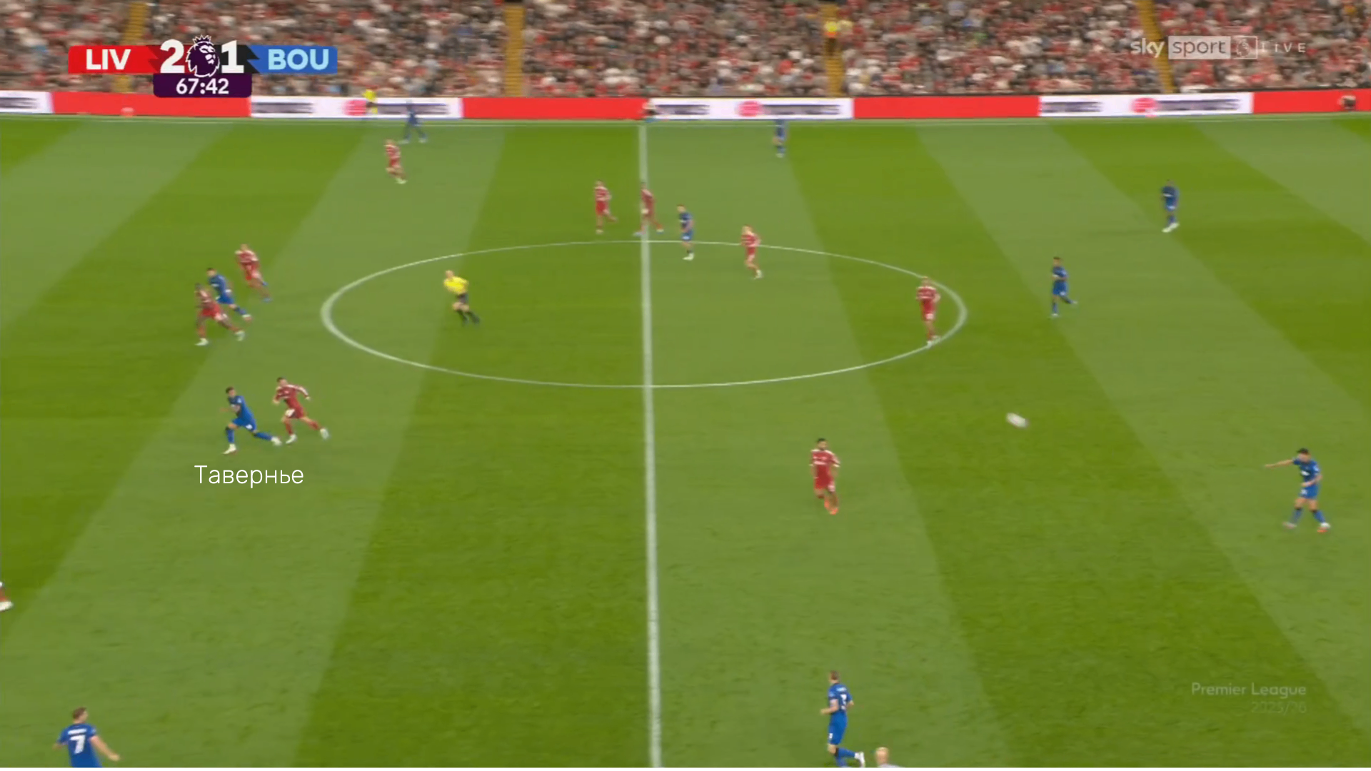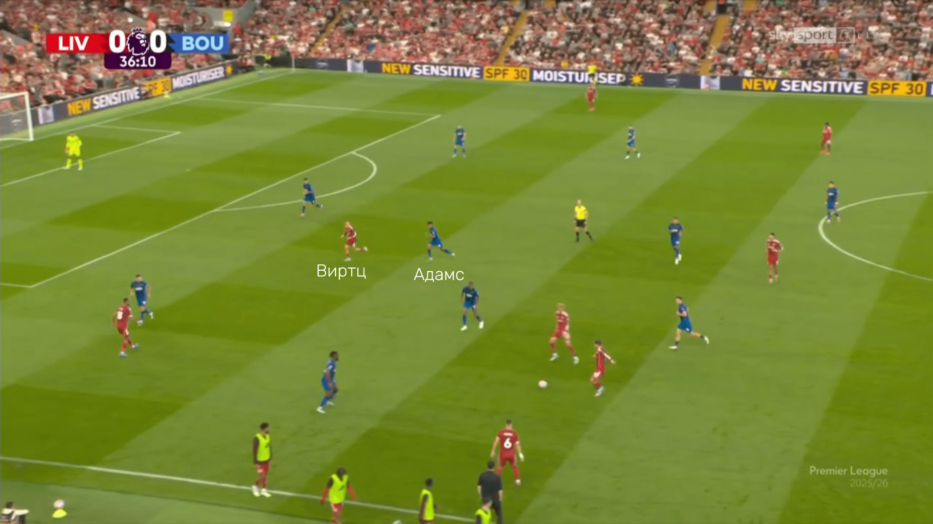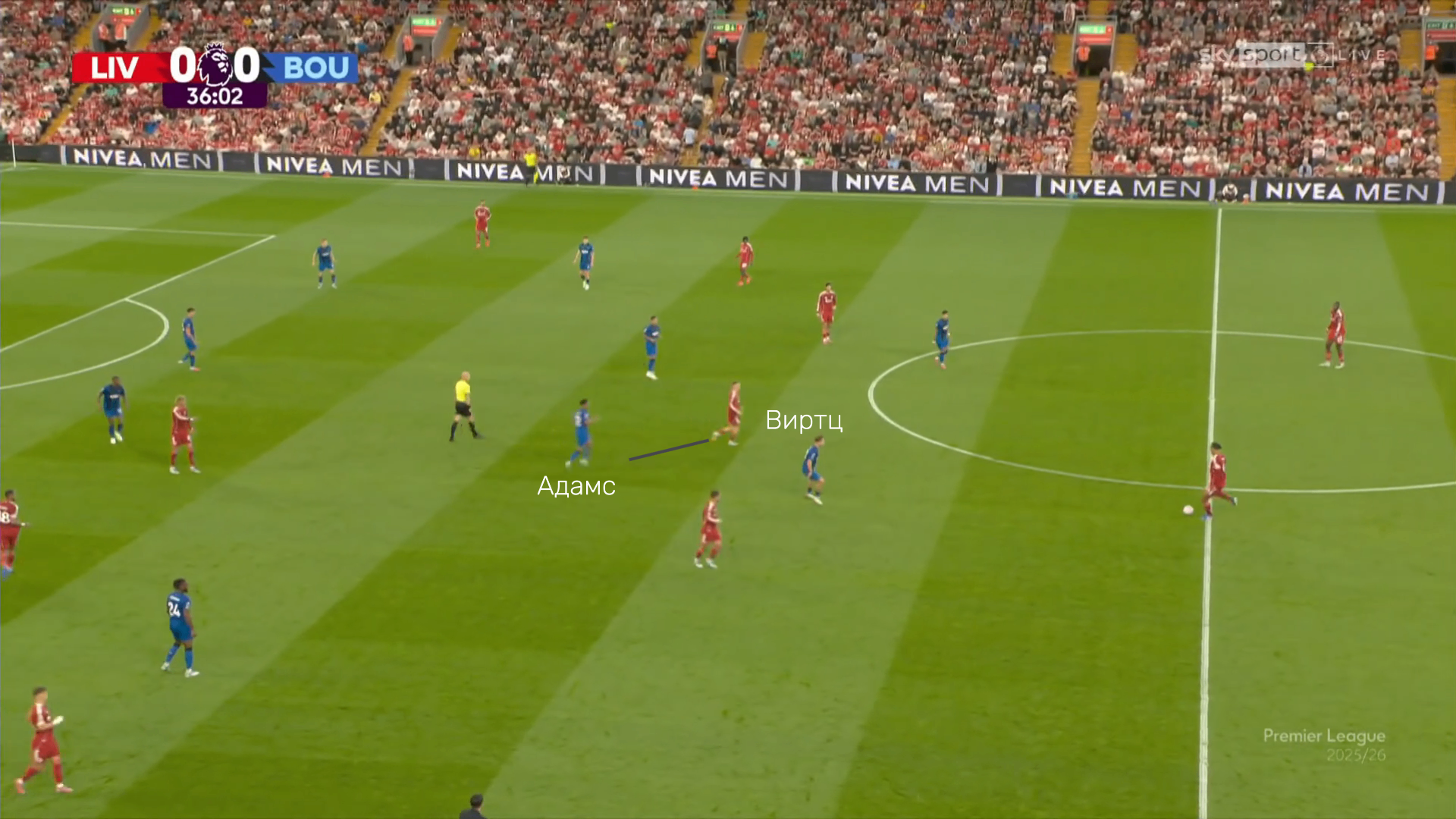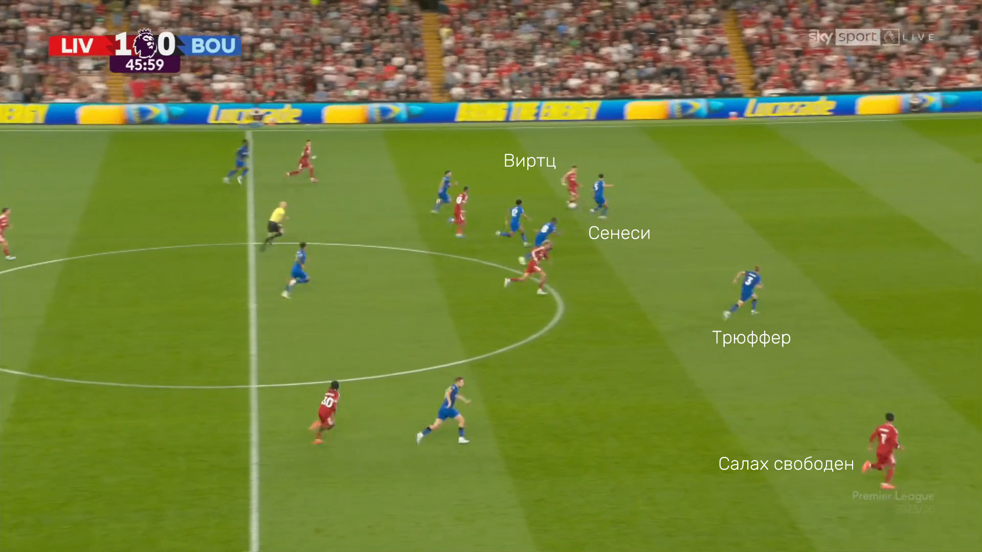 Это пример скорее негативный, ведь Виртц освободил зону Сенеси и ее приходится контролировать Трюфферу, который, в свою очередь, оставляет Салаха открытым. Но для того, чтобы Виртц оказался с мячом в такой позиции, до этого Гакпо и Экитике по очереди выиграли борьбу и отдали точные передачи, защитники «Борнмута» все же не всегда дают соперникам так свободно переигрывать себя. Ну и конечно не у всех в АПЛ есть футболисты такого уровня, как у «Ливерпуля». Вот почему такие ситуации случаются редко, а в большинстве случаев «Борнмут» выигрывает от такой смелой игры Сенеси.
