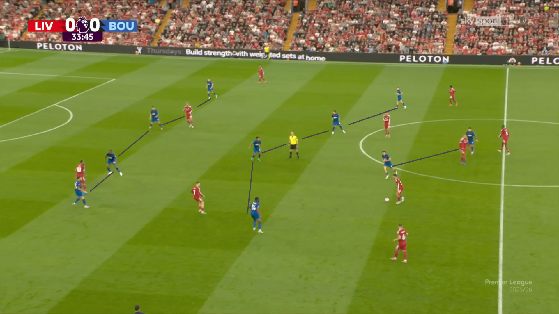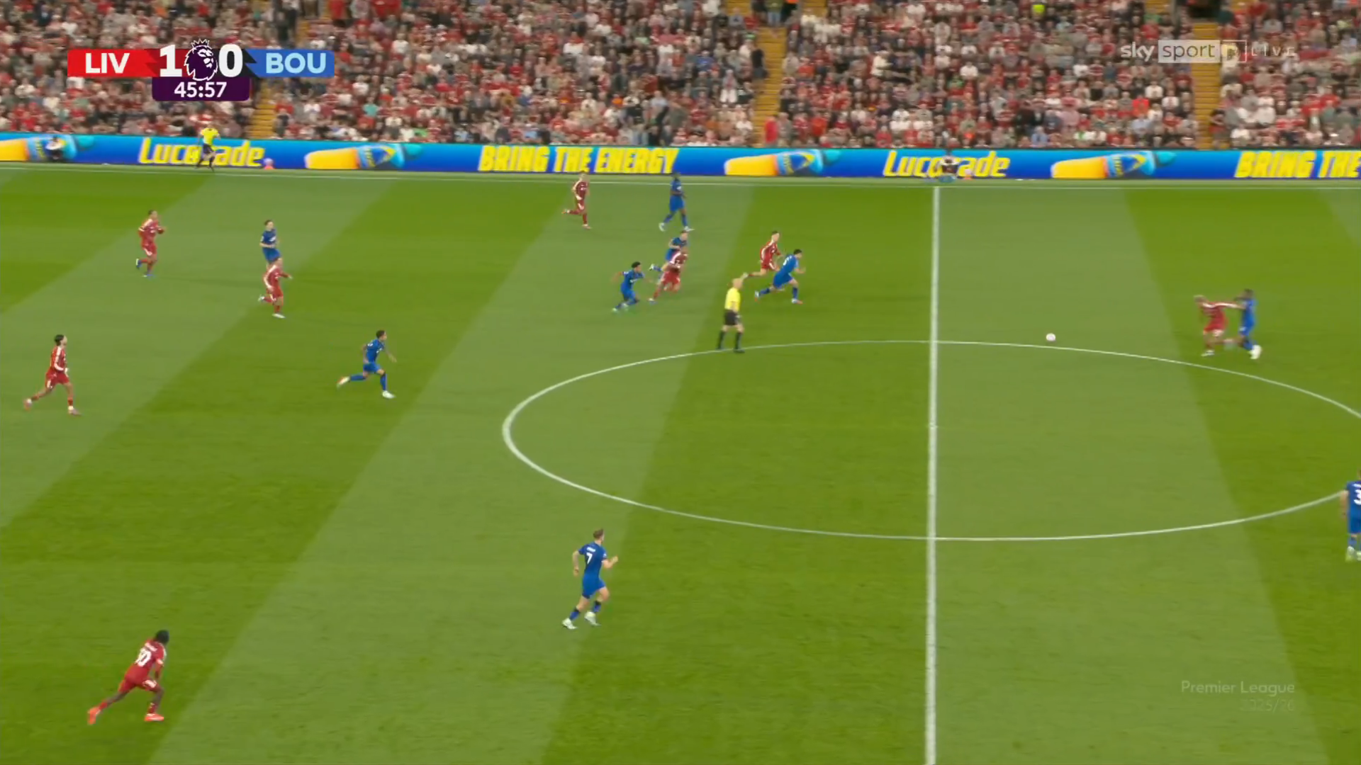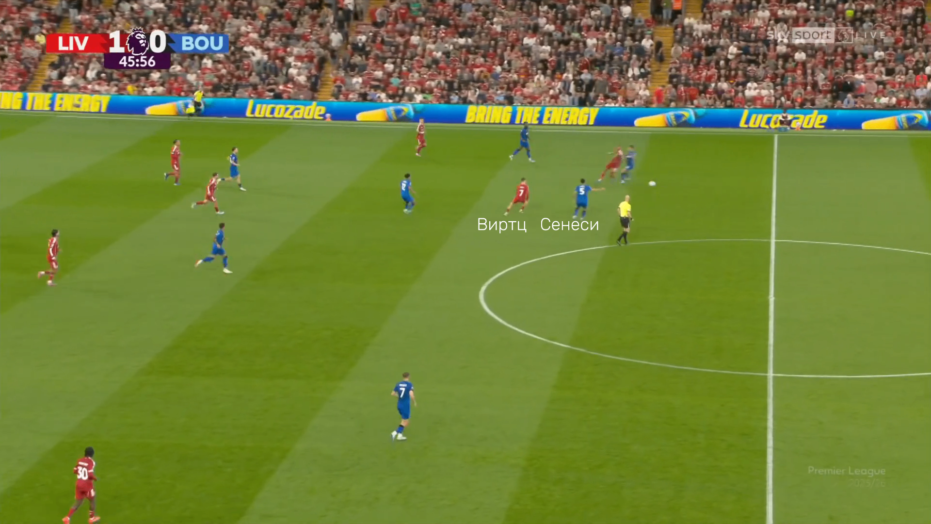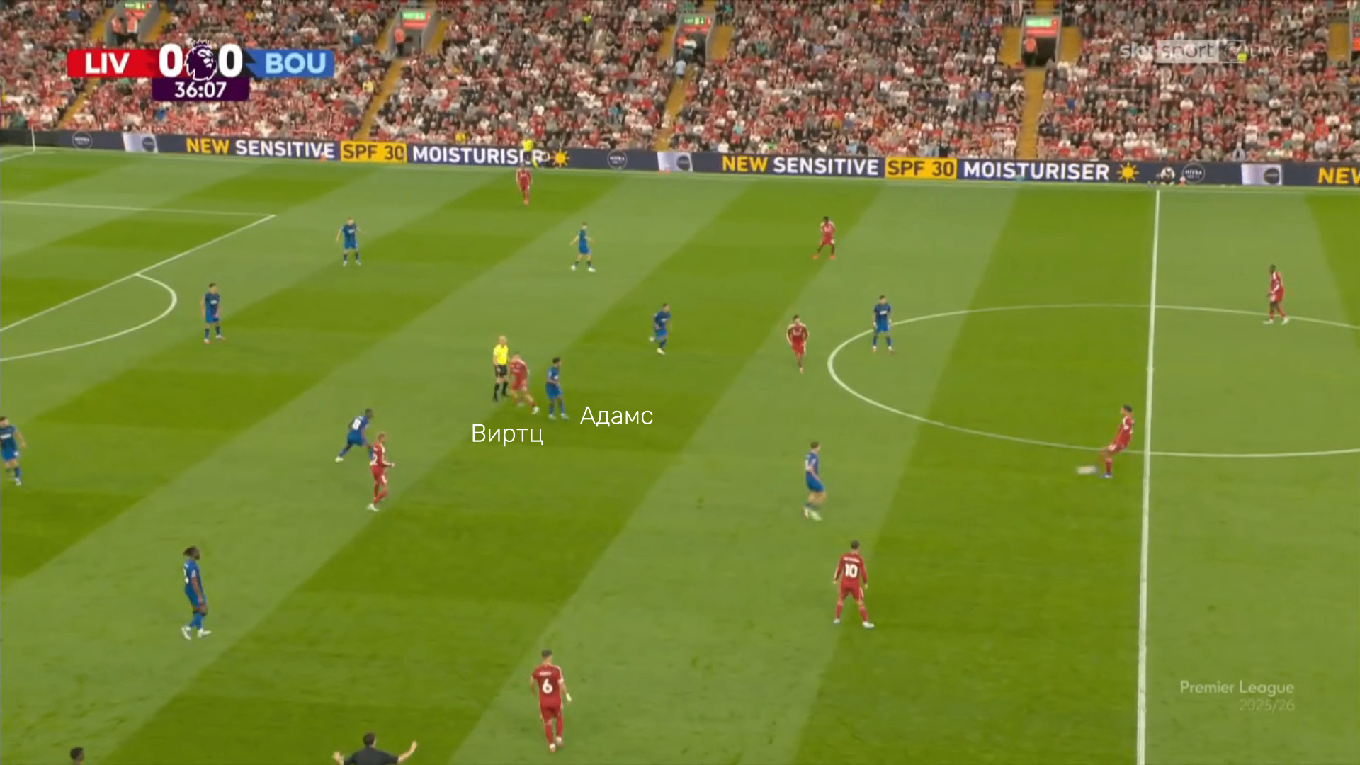 Это пример скорее негативный, ведь Виртц освободил зону Сенеси и ее приходится контролировать Трюфферу, который, в свою очередь, оставляет Салаха открытым. Но для того, чтобы Виртц оказался с мячом в такой позиции, до этого Гакпо и Экитике по очереди выиграли борьбу и отдали точные передачи, защитники «Борнмута» все же не всегда дают соперникам так свободно переигрывать себя. Ну и конечно не у всех в АПЛ есть футболисты такого уровня, как у «Ливерпуля». Вот почему такие ситуации случаются редко, а в большинстве случаев «Борнмут» выигрывает от такой смелой игры Сенеси.