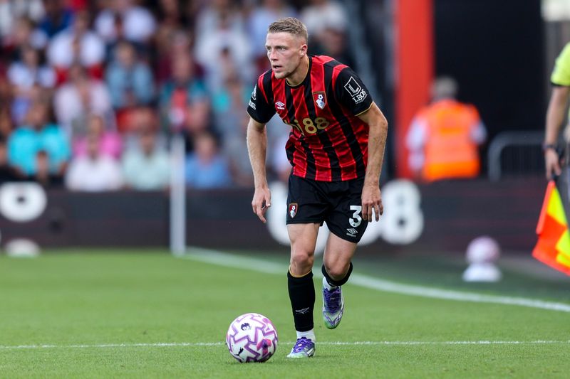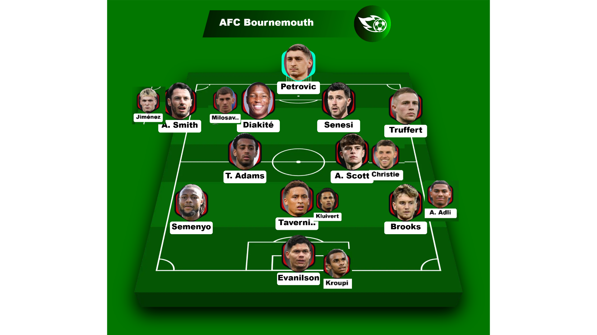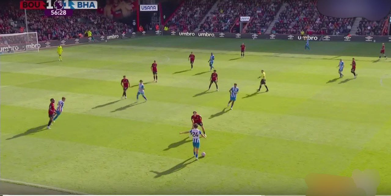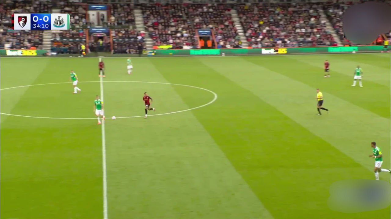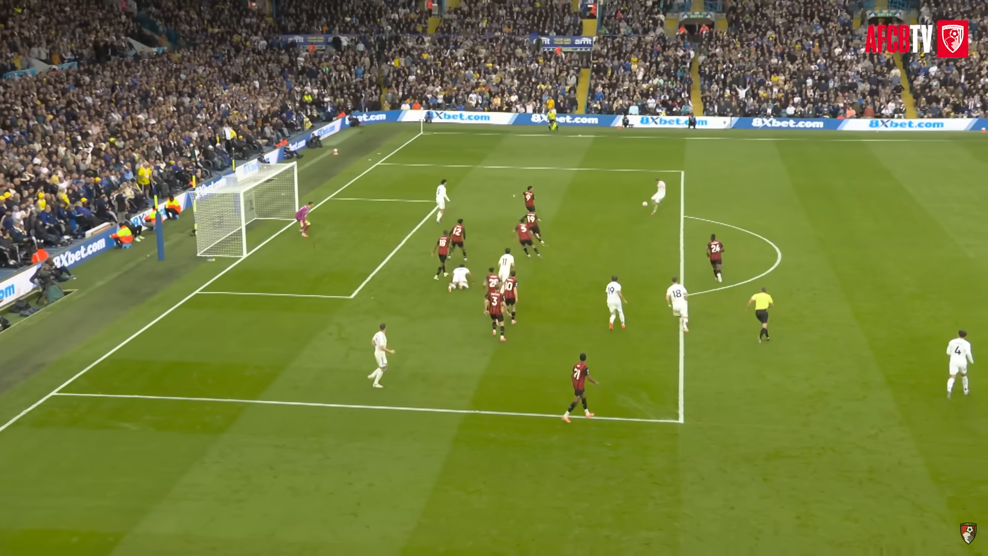 Как правило, справа у «Борнмута» похожая динамика. Но атаки через правый фланг проходят реже. И еще реже в них участвует правый защитник. Можно сказать, что справа игроки «Борнмута» создают перевес. Диаките, правый защитник, правый вингер, Тавернье и Адамс часто собираются там для того, чтобы соперник переместился на правую часть поля, а потом быстро перевести налево. Тем самым они выигрывают несколько лишних секунд и метров пустого пространства для Трюффера и левого вингера (либо Семеньо либо Брукс) и иногда Скотта. Они, в свою очередь, хорошо им пользуются, разыгрывая комбинации. Также левым центральным защитником у «Борнмута» играет Маркос Сенеси, и он тоже умеет пользоваться пустым пространством, отдавая длинные передачи или протаскивая мяч вперед.