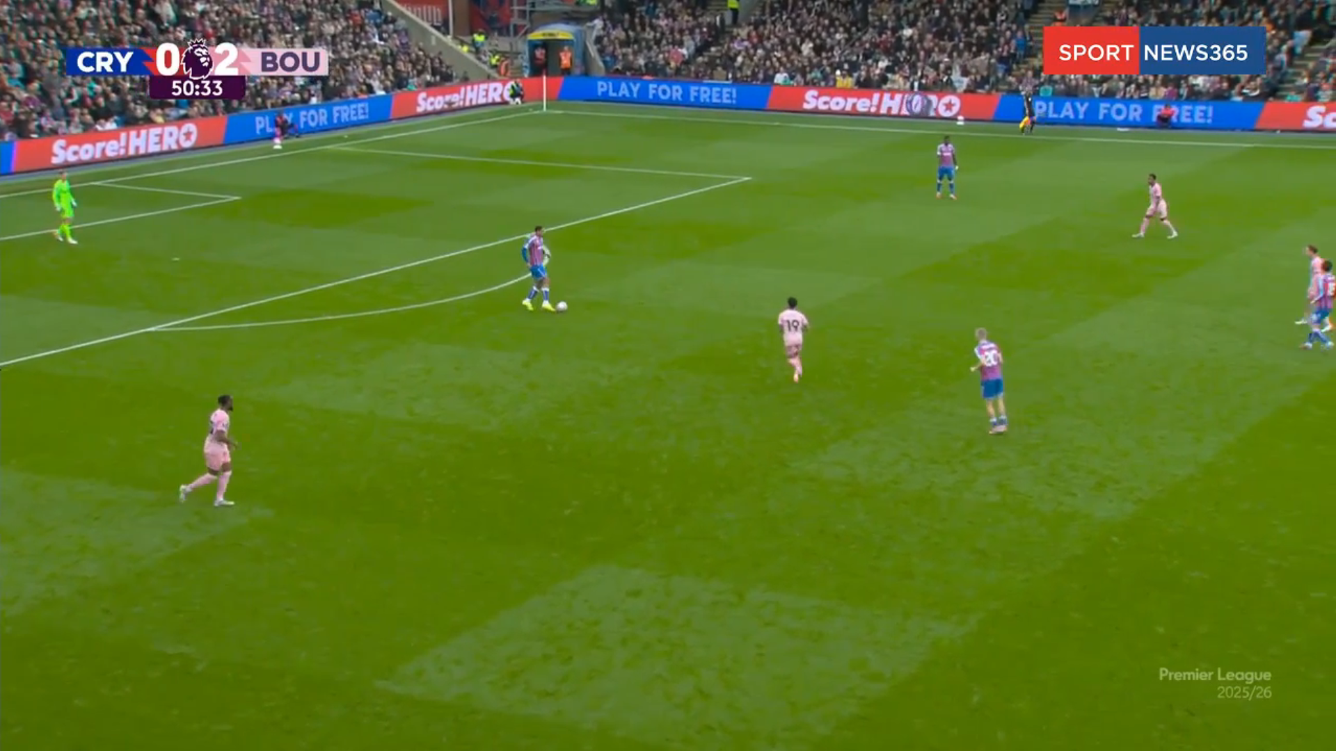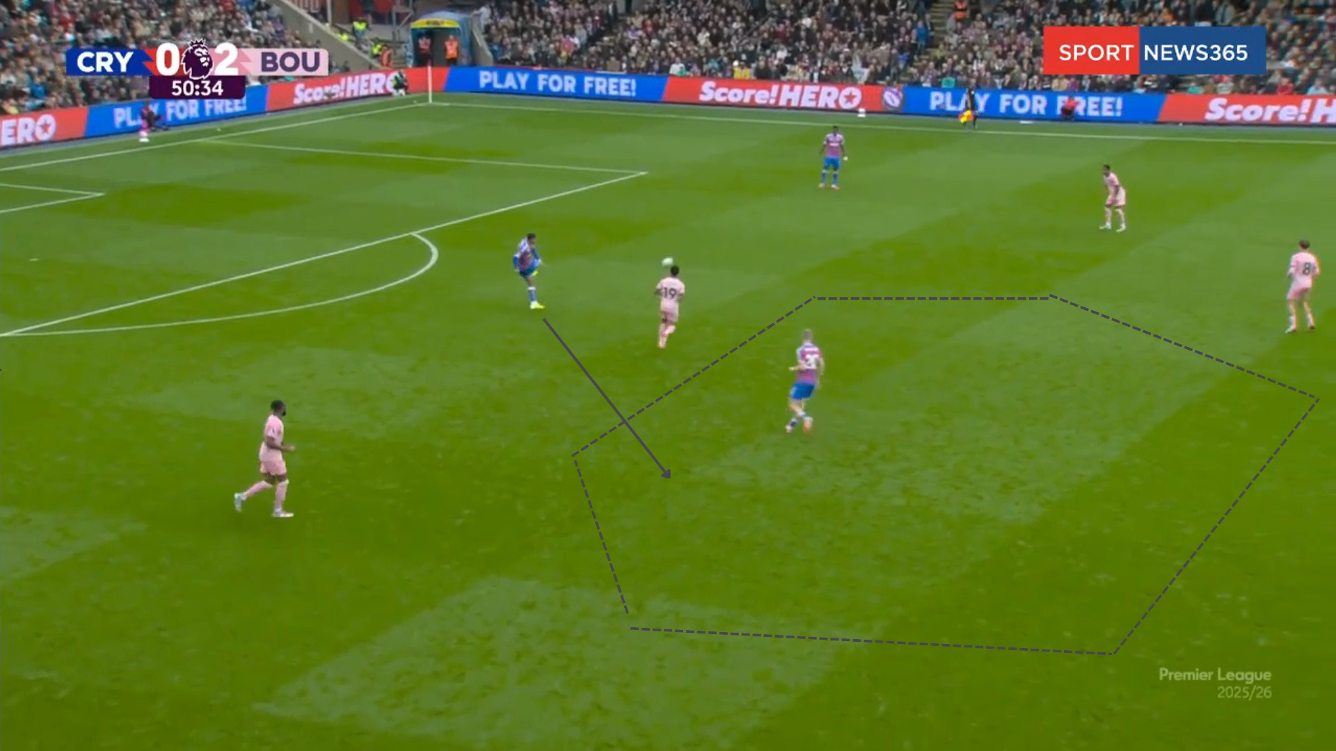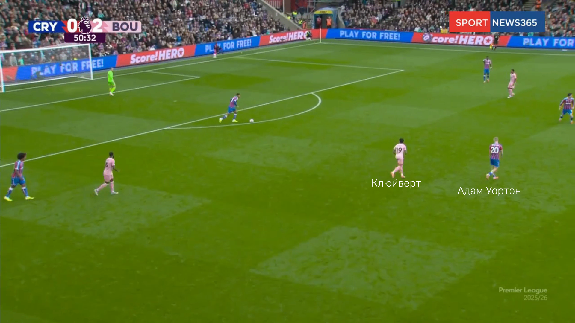 А вот пример из матча против «Кристалл Пэлас», наверное, худшего матча «Борнмута» в этом сезоне. Ираола адаптировал свой прессинг с матча против «Ньюкасла». Теперь подопечные испанца давали свободу центральному защитнику хозяев, нападающий Крупи и левый вингер Семеньо закрывали крайних центральных защитников, а против левого латераля играл Тавернье, который в этом матче вышел справа в атаке.