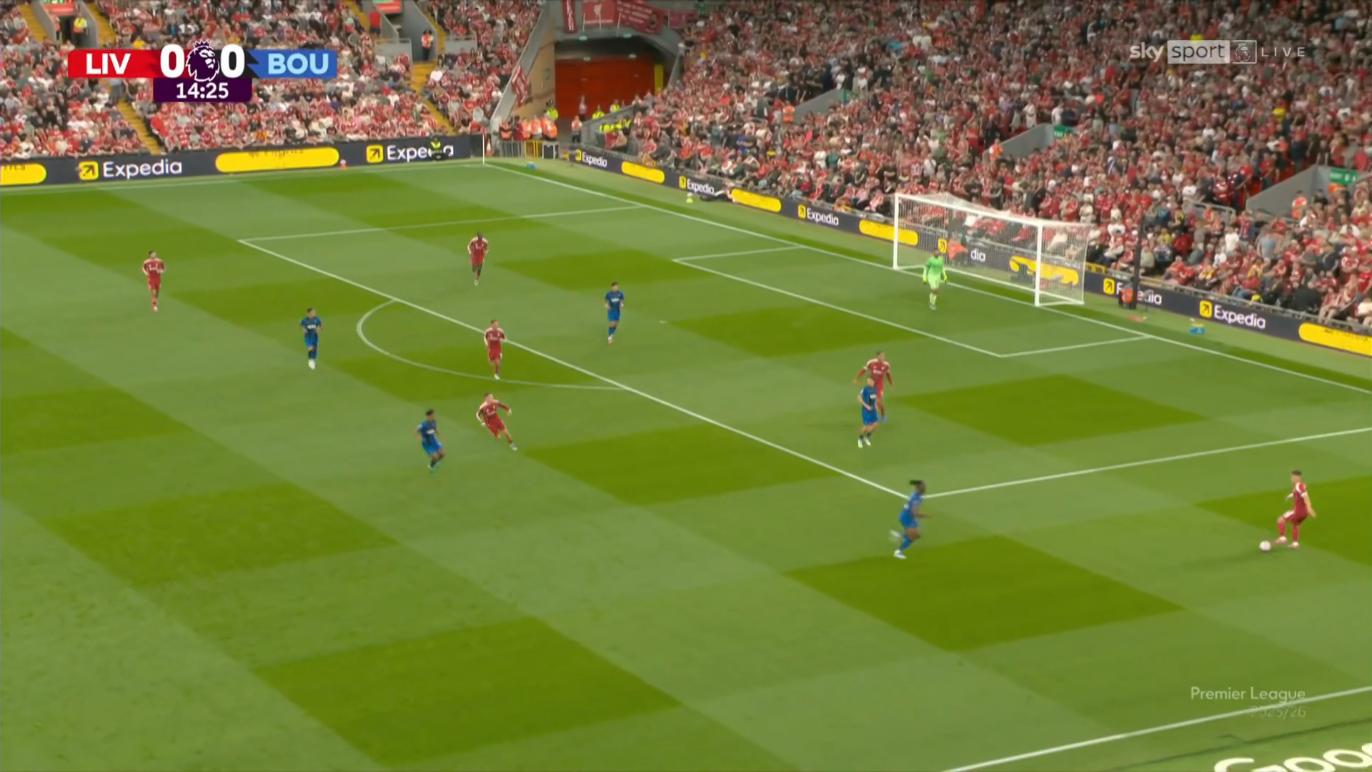 Речь не столько про дриблинг, сколько в целом про индивидуальность, как способ вскрытия обороны команды Ираолы. Кроме вингеров мы можем использовать десятку, которая будет искать мяч между линиями, создавать пространство для партнеров за спиной защитников Борнмута. Хороший пример – Виртц, сейчас его принято ругать, но матч против «Борнмута» он отыграл неплохо. Гол Салаха тоже пример индивидуального мастерства.