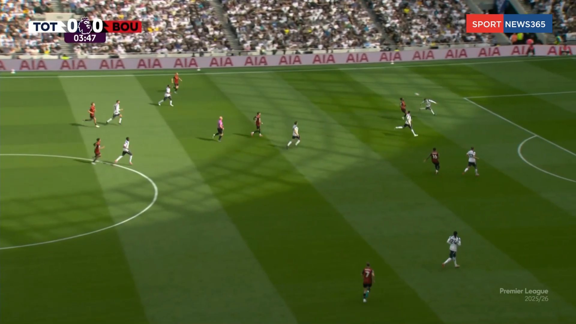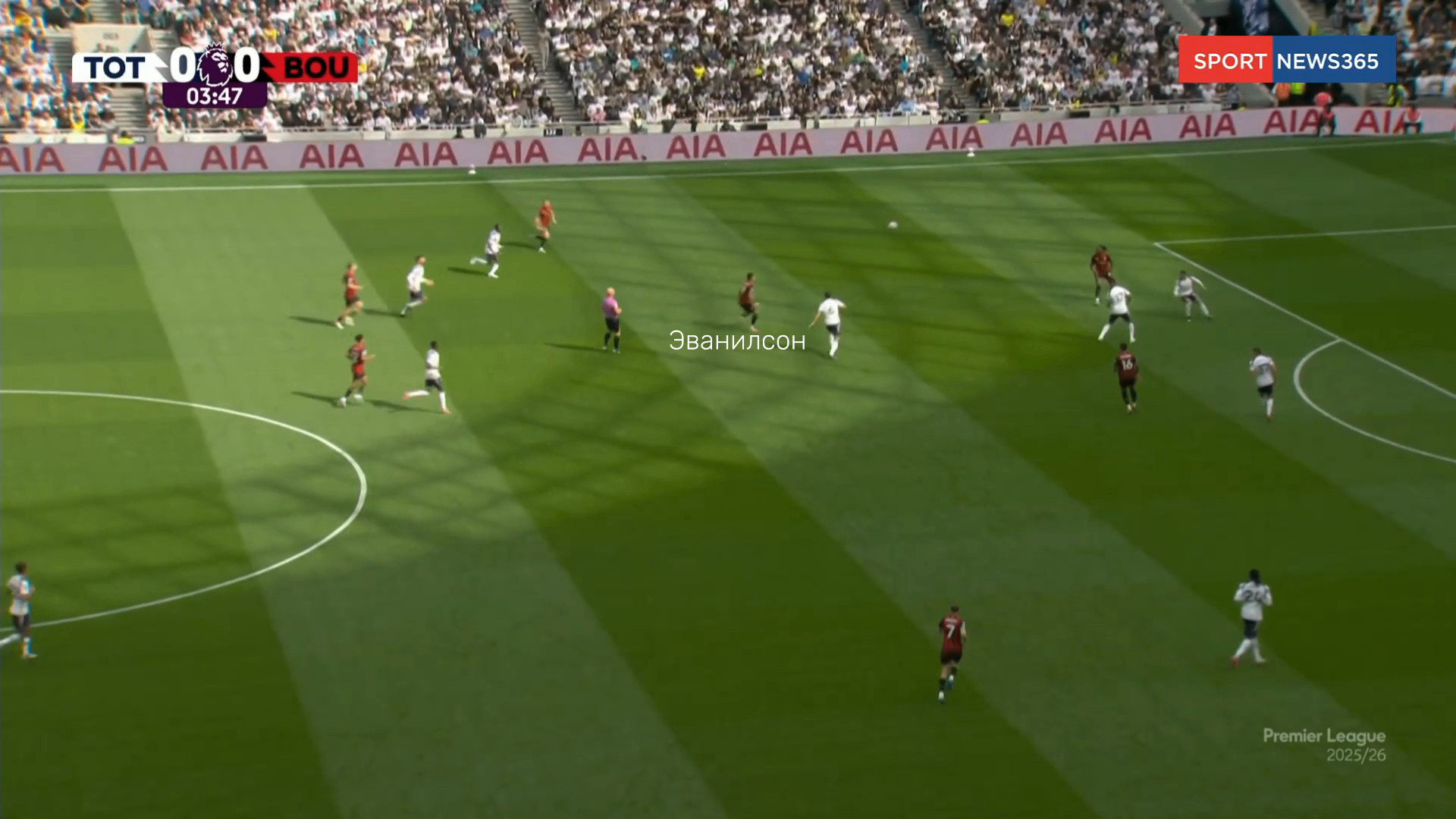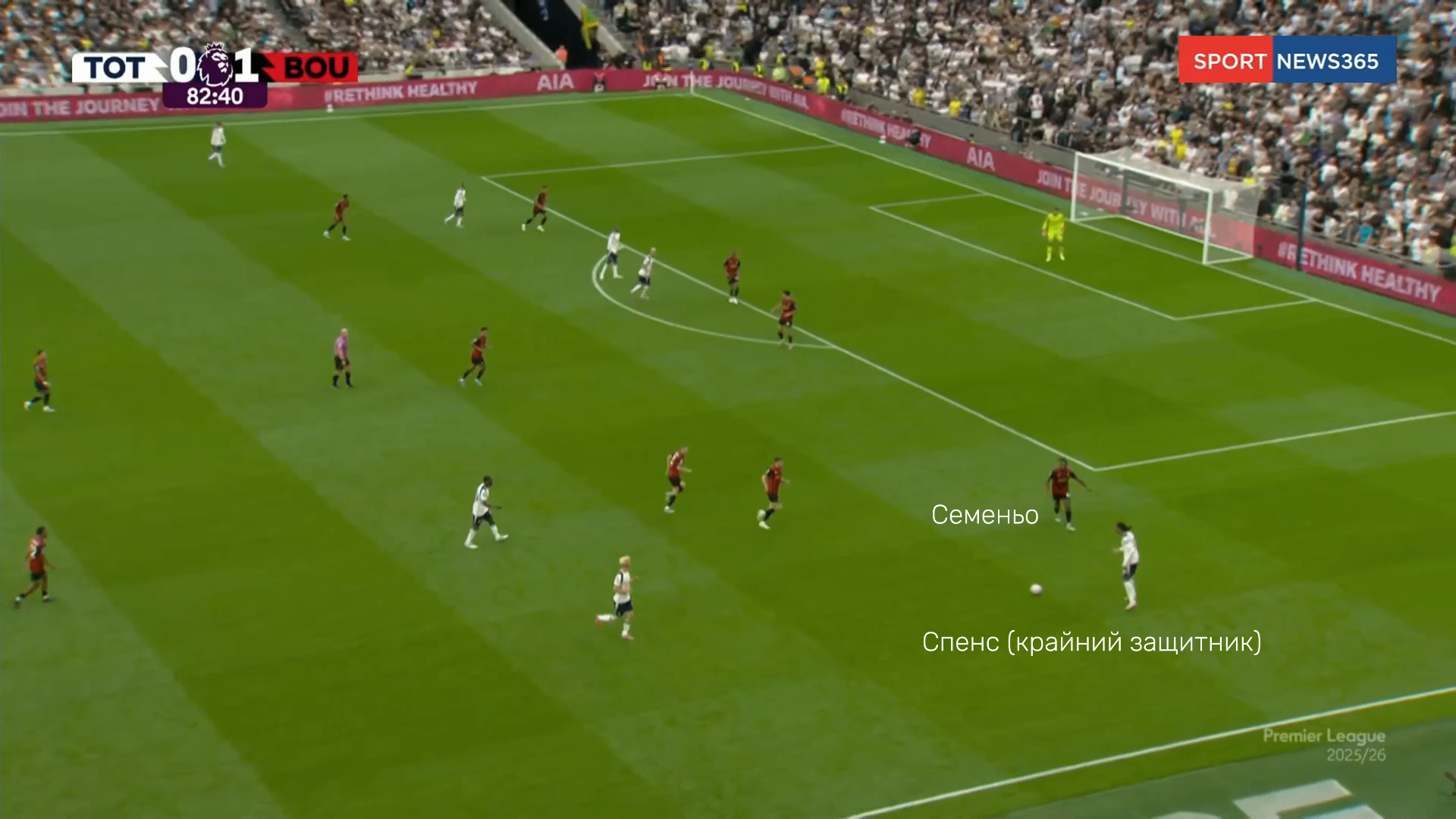 Тавернье делает очень много таких рывков. Вот конкретный эпизод, где Эванилсон опустился в центр поля и вытянул центрального защитника «Тоттенхэма» Кристиана Ромеро, а в освободившуюся зону вбежал Тавернье и продолжил атаку передачей на Семеньо. От гола в этой ситуации «Тоттенхэм» спасла великолепная реакция Викарио. (тайм-код – 1:19).