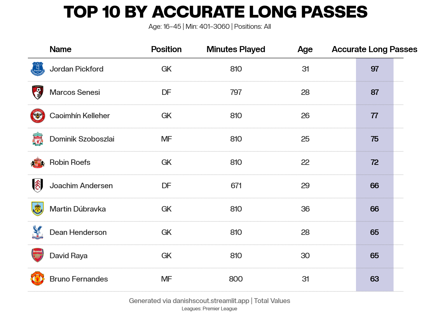 По данным FBref «Борнмут» в АПЛ идет на втором месте по числу попыток длинных передач (688 всего, за игру 76), а также находится в нижней десятке по таким продвинутым показателям, как: